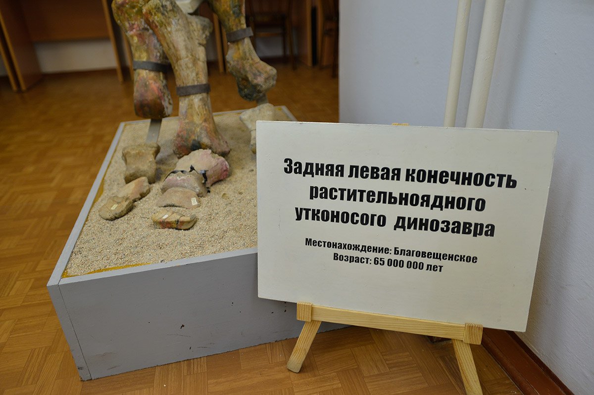 Здесь можно узнать, что изучение древних ящеров в Приамурье началось в далеком 1902 году, когда полковник Манакин увидел, как амурские рыбаки привязывают к сетям необычные грузила — старинные кости. Полковник заинтересовался, где такие «грузила» добывают, и рыбаки отвезли его на китайский берег Амура — показали место.