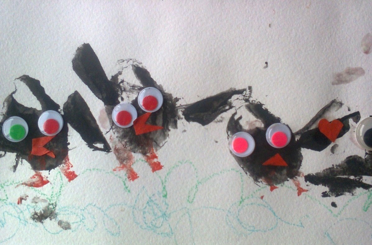 Разрезаешь картофелину пополам, макаешь срез в краску, а потом печатаешь им. Недавно мы так нарисовали пингвинов.