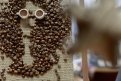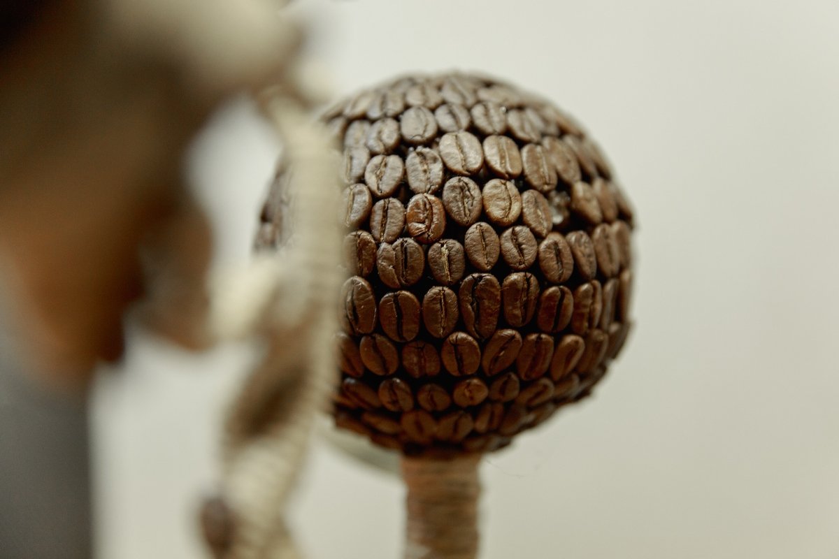 Зерна кофе клеятся на шарик в два слоя. Выбрать зернышки лучше поровнее, советует мастерица. «В первом слое зерна клеятся так, чтобы ребристой стороной зернышко прилегало к поверхности шарика. Второй слой делается наоборот — ребристая сторона зерна будет лицевой, — отмечает Оксана. — Есть также метод торцевания, когда зернышки приклеиваются к шарику острым кончиком».