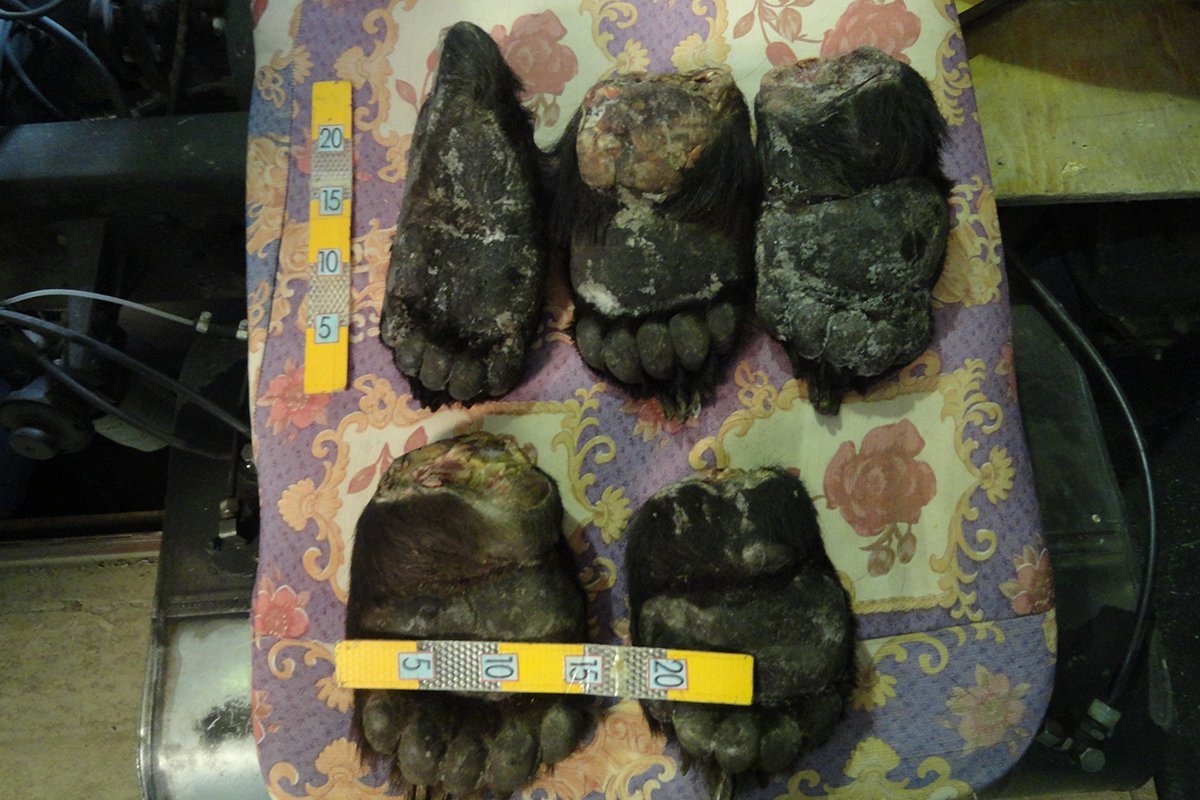 — При осмотре автомобиля, который выезжал из России в КНР в инструментальном ящике был обнаружен тайник, в котором находились две медвежьи лапы. При дальнейшем осмотре транспортного средства в кабине водителя были найдены еще три медвежьи лапы, — сообщили в пресс-службе ПУ ФСБ России по Амурской области.