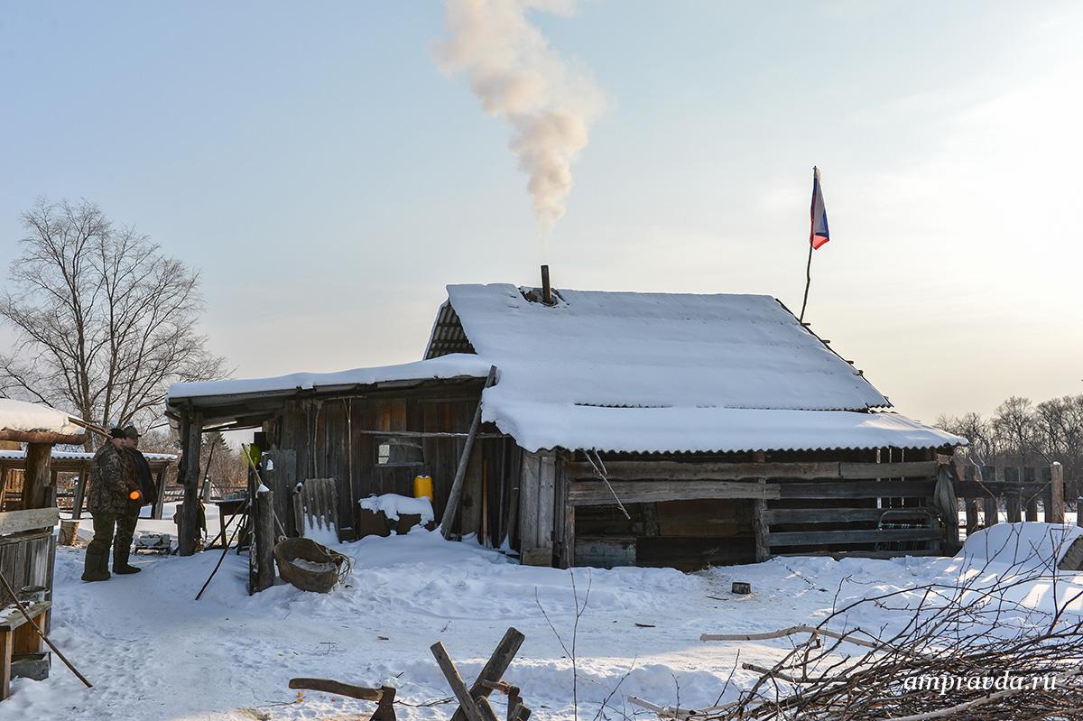 Три деревянные избушки на высоком берегу реки Архары среди белого ослепительного таежного безмолвия, как ложка дегтя в бочке меда. Над одним домом гордо веет триколор. «Неужто охотники свое зимовье российским флагом обозначили? Это чтобы отпугнуть зверя или непрошеных гостей», — спрашиваем у сопровождающего нас охотоведа Андреевского заказника Ивана Адаменко, с которым корреспонденты АП отправились в это богом забытое место следы тигра искать. «Да нет, здесь уже три года одинокий пенсионер живет, — поясняет он. — Его все Митричем зовут, а еще мэром Татакана. Очень почетная должность, если учесть, что в селе лет двадцать уже никто не живет».
