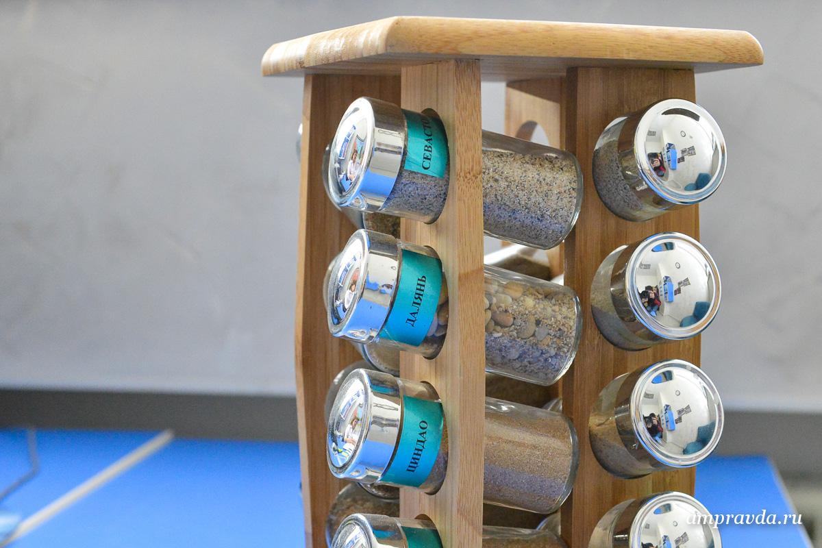 За годы работы потихоньку да помаленьку насобиралась внушительная коллекция зыбучего песка — более пятнадцати видов. География сыпучего природного материала из России — от Севастополя и до самых приморских окраин страны. Темно-серый привезен из Турции, серебряный и мелкозернистый из Китая. Белый и мягкий, словно мука, собран на Филиппинах. Для частички матушки-земли приспособили целый набор для специй. Правда, песочек так привлек чье‑то внимание, что кто‑то из гостей унес одну бутылочку с собой. Песок здесь предназначен не только для созерцания, но и для работы. Это великолепный наглядный материал. По нему определяют, какой пляж предпочитает клиент. А еще от песка исходит особая энергетика и положительный заряд. Посмотрел на сыпучий предмет, потрогал, потряс и вспомнил о прекрасно проведенном отпуске.