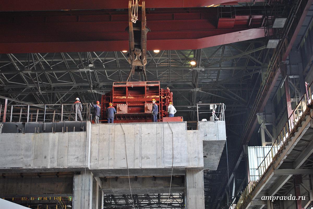 В турбинном цехе, где работают три действующие турбины, идет монтаж четвертой — уже установлен статор генератора, его вес 122 тонны.