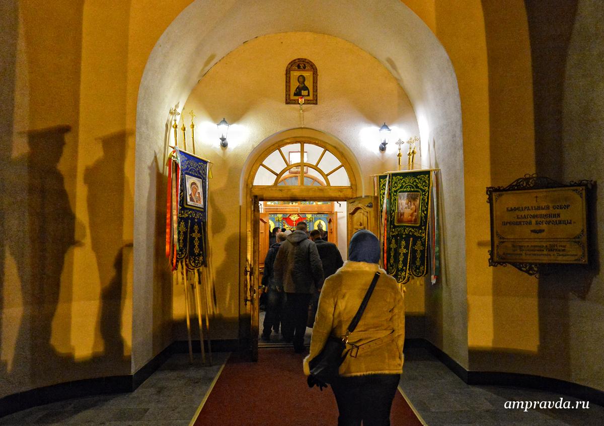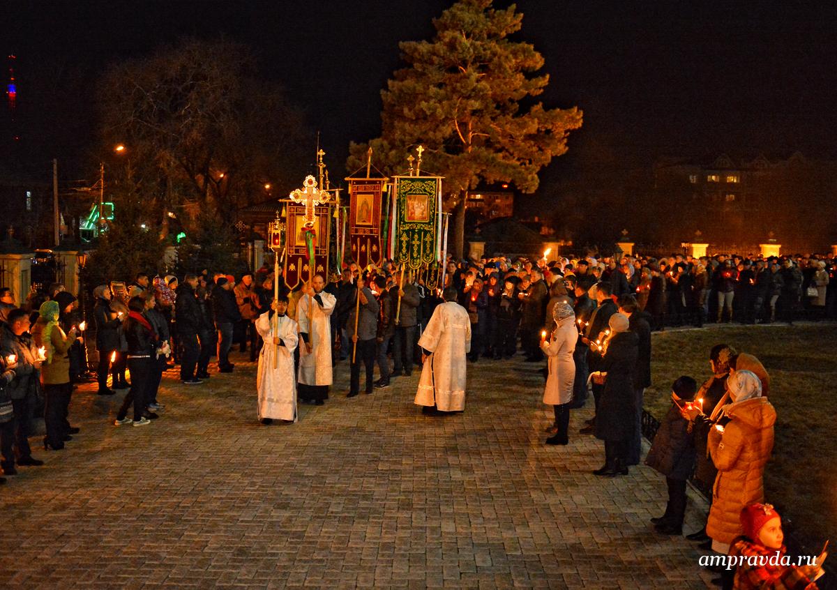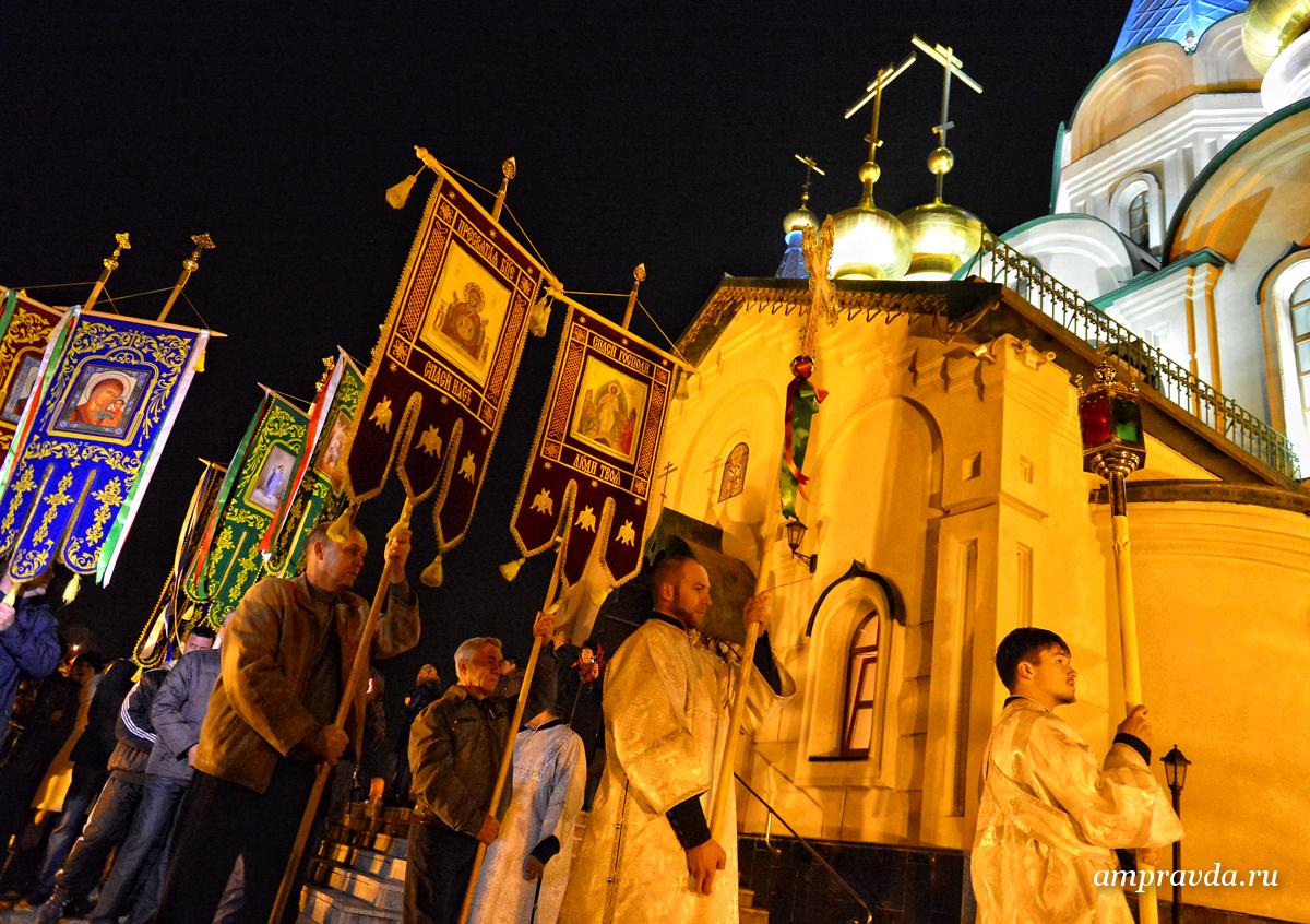 Помещение и двор собора не смогли вместить всех желающих. Под звон колоколов люди прошли с иконами и свечами. Крестный ход прошел также около Гавриило-Архангельского храма, который расположен на перекрестке улиц Горького и 50-летия Октября. Здесь собрались более трехсот благовещенцев. После крестного хода в храмах началась пасхальная утреня и литургия святого Иоанна Златоуста. В Благовещенском кафедральном соборе традиционное богослужение провел епископ Благовещенский и Тындинский Лукиан. Также во всех храмах и церквях сегодня будут освещать пасхальную снедь. За таинством наблюдал фотокорреспондент АП Андрей Ильинский.