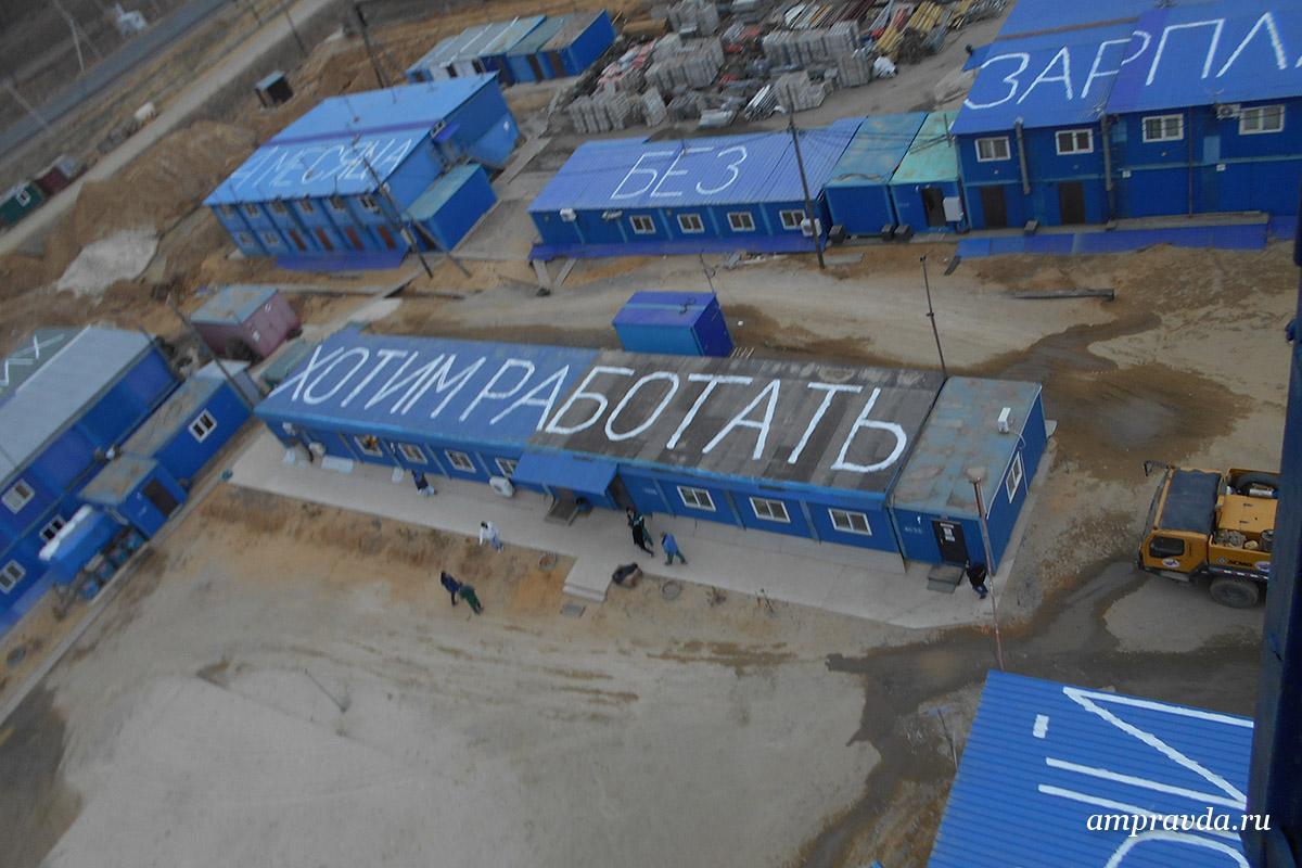 Отчаявшиеся получить заработанные деньги строители забрались на крыши вагончиков, написали огромные буквы белой краской, затем со строительной вышки сделали фотографии необычного обращения. Снимки и обращение они отправили на прямую линию с президентом, губернаторам Амурской области, Приморского края и в редакцию «Амурской правды». «Мы готовы на все, чтобы привлечь внимание Президента России к нашей проблеме», — признались АП сотрудники Тихоокеанской мостостроительной компании.