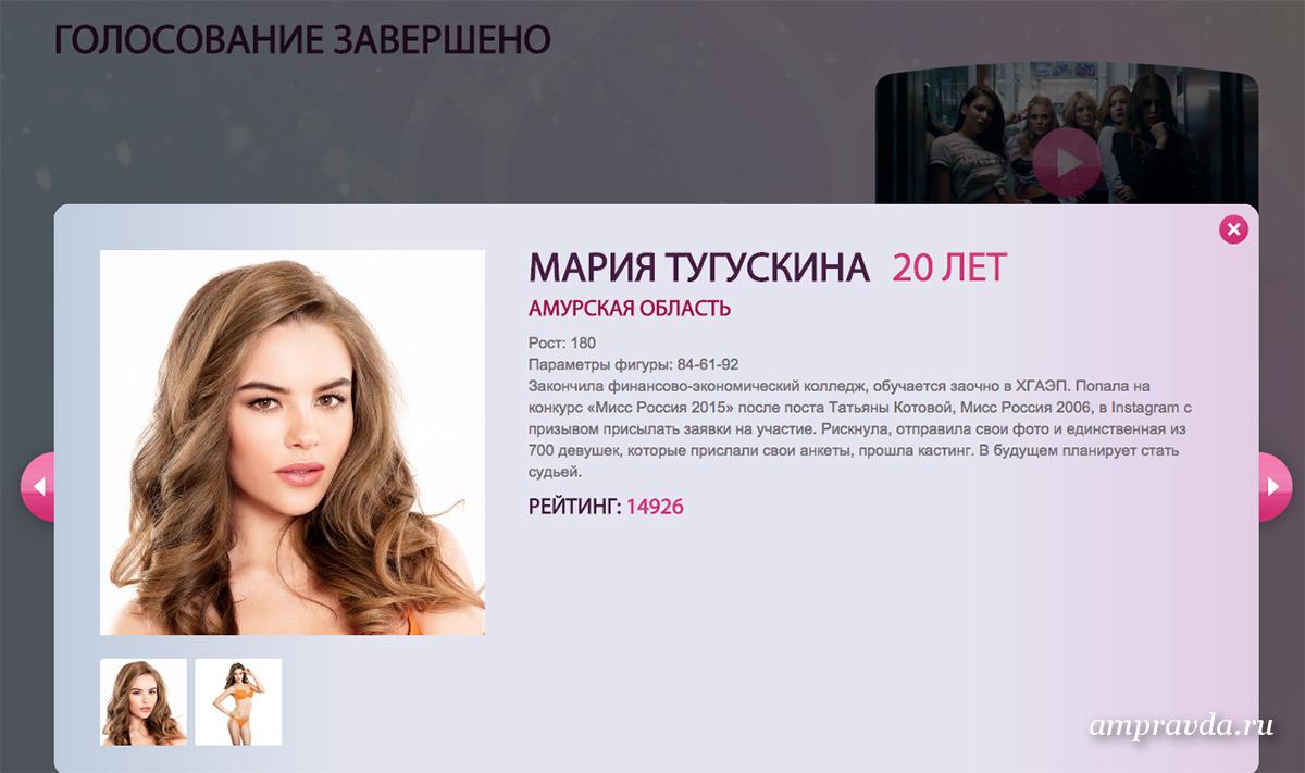 То, что Мария вышла в финал, стало известно 18 апреля в 18 часов – во столько завершилось зрительское голосование. За амурскую красавицу проголосовали 14 926 раз. Разрыв с 11-м местом составил всего 11 голосов. Вместе с Машей в зрительской десятке оказались девушки из Якутии, Ростова-на-Дону, Волхова, Ярославля, Тюменской области, Хабаровска, Екатеринбурга, Таганрога и Челябинска.