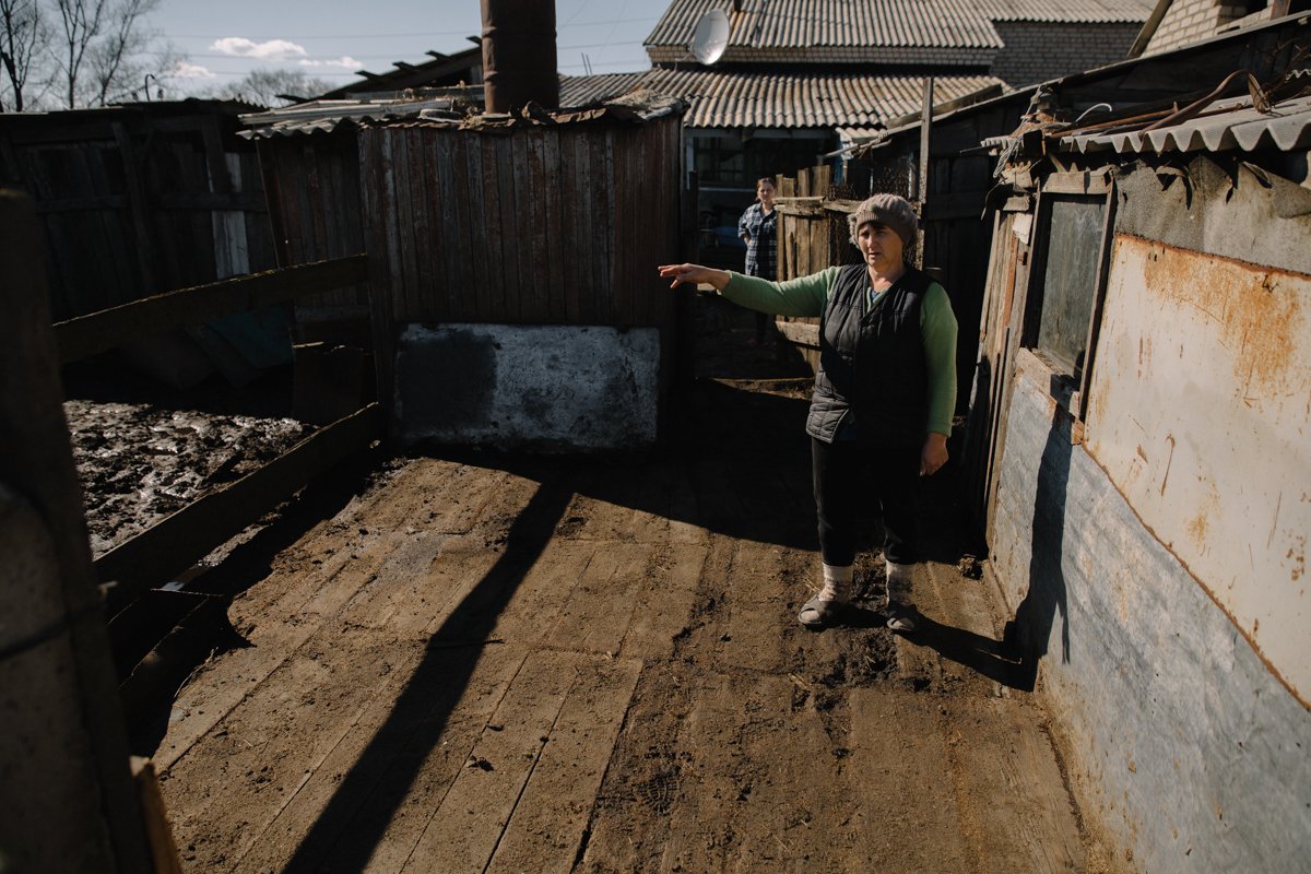 Неподалеку от загонов у Ивановых стоит душ, куда тянется электропроводка. Ветхое строение тоже начало проседать в трясину.
