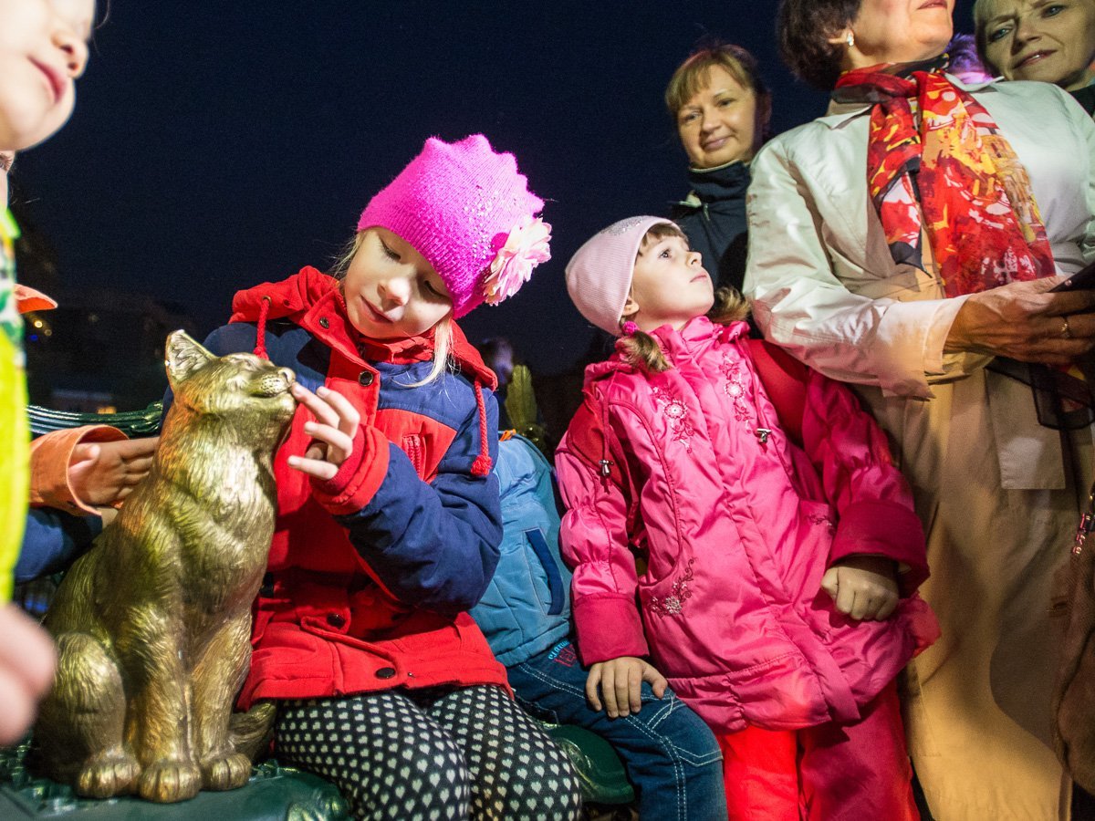 Церемония открытия началась около 18.00. Организаторы сорвали праздничную обертку, отпустив в небо облако белых шаров, и взору зрителей предстали бронзовые кот, пес и сорока. Скульптурная композиция, на которой запечатлена очаровательная троица, называется «Невозмутимый кот». Усато-полосатый важно восседает на лавочке, не глядя ни на назойливую птицу, ни на заливающегося лаем пса. Все герои отлиты из чугуна на старейшем литейном предприятии России — Каслинском заводе архитектурно-художественного литья, что в Челябинской области. Уже готовую скульптуру покрыли бронзой.