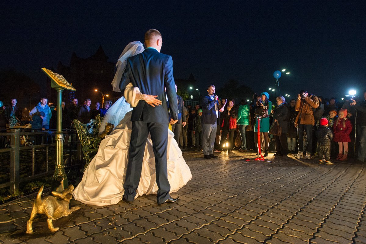 Подарок был тут же оценен по достоинству. Ребятишки начали гладить котика, тереть ушки псу и сорочий клюв. Первыми на скамейку присели молодожены — Юлия и Григорий Жуковы. «Это здорово, что в городе появилось новое знаковое место для молодоженов. И мы первыми его посетили! Мы очень обрадовались, когда нас пригласили. Уже завтра здесь появятся новые пары, а фотографии разлетятся по социальным сетям и памятным альбомам», — поделились впечатлениями новоиспеченные супруги.