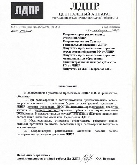Кстати, он продемонстрировал любопытный документ, который напрямую касается действий, а точнее беспринципного бездействия другой политической силы — фракции ЛДПР. Спикер показал коллегам копию распоряжения Центрального аппарата Либерально-демократической партии России, в котором приказано: