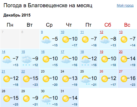 По их словам, в ближайшее время ждать снега не приходится — до 14 декабря осадков в столице Приамурья не прогнозируется. Но уже 15 декабря, по данным портала Гисметео, в городе возможен снег. Кроме непривычного бесснежья в Благовещенске воцарилась и небывало теплая для зимы погода. По информации метеорологов, среднесуточные температуры в городе выше нормы на 3,4 градуса — около -15 градусов, в то время как должны быть -18,4.