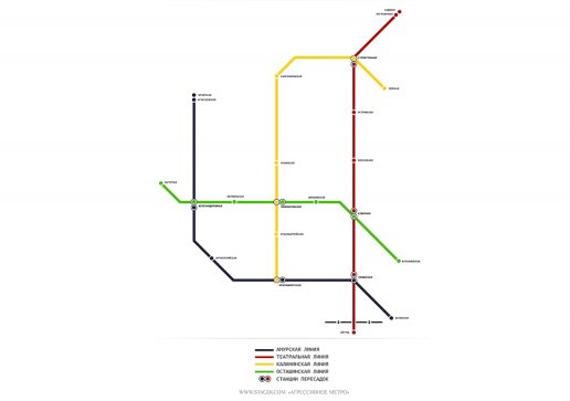 Студия агрессивного дизайна из Красноярска представила, как могло бы выглядеть метро в областном центре Приамурья, и нарисовала вариант схемы благовещенской подземки. На карте придуманного ими метрополитена четыре ветки: Амурская (черная линия), Театральная (красная), Калининская (желтая), и Осташинская (зеленая).