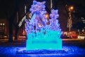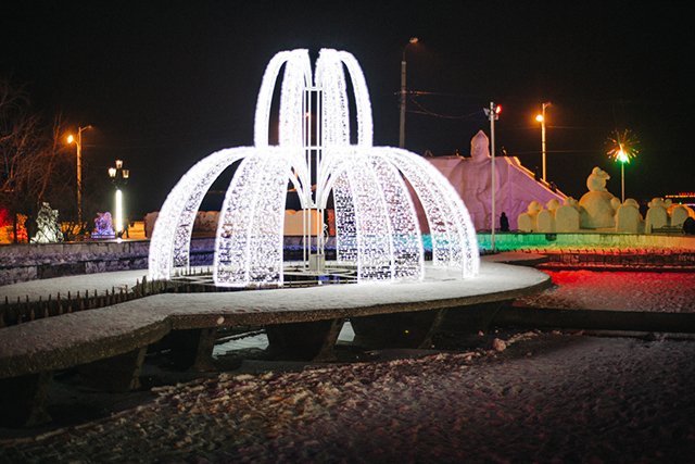 В этом году зимний городок украшен декоративной светящейся конструкцией, установленной в центре фонтана.