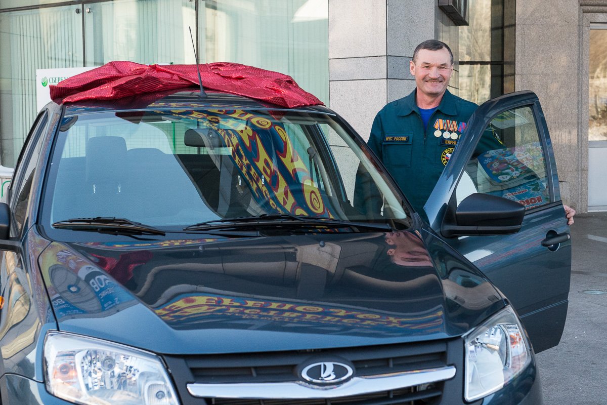 Но все-таки главным призом стал легковой автомобиль Lada Granta, стоящий с красным бантом на улице возле входа в ОКЦ. Ключи от отечественного авто Владимиру Царёву вручил глава региона.