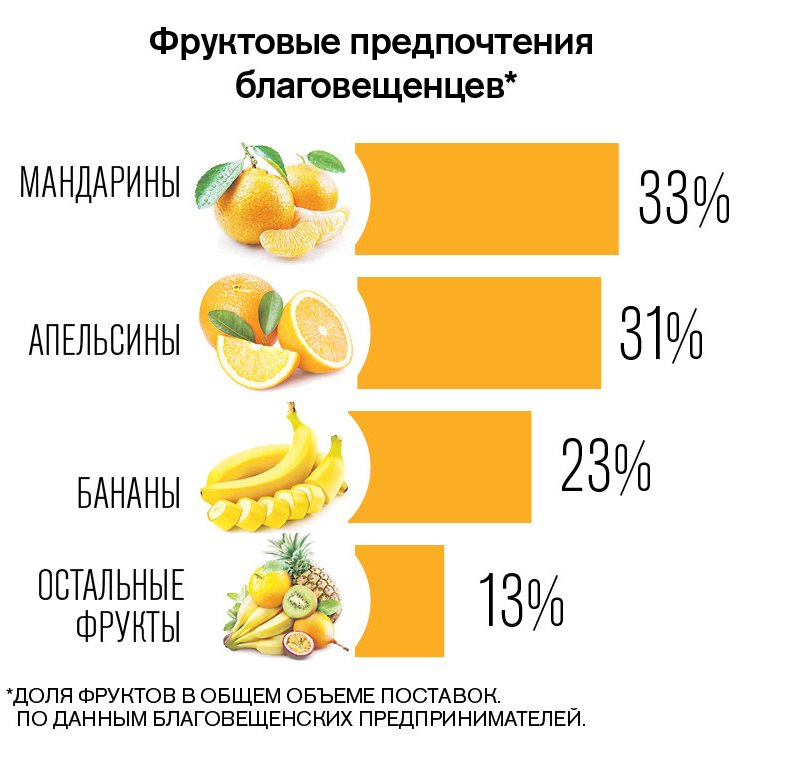 — Повышенный спрос на бананы мы отметили еще этой осенью. Если в прошлом году хорошо в продажу шли апельсины и мандарины — мы их заказывали целыми машинами, то теперь люди охотно раскупают бананы. В декабре по ним вообще перевес — составляют 80 процентов от всех завозимых фруктов. С чем это связано, можем только предположить — наверное, год Обезьяны наступает, — рассказывает индивидуальный предприниматель из Благовещенска Виталий, который занимается оптовыми поставками фруктов и овощей в город и область. — Кстати, у амурчан проявился интерес и к грейпфруту, в каждой машине у нас теперь «едет» по полторы-две тонны этого фрукта.