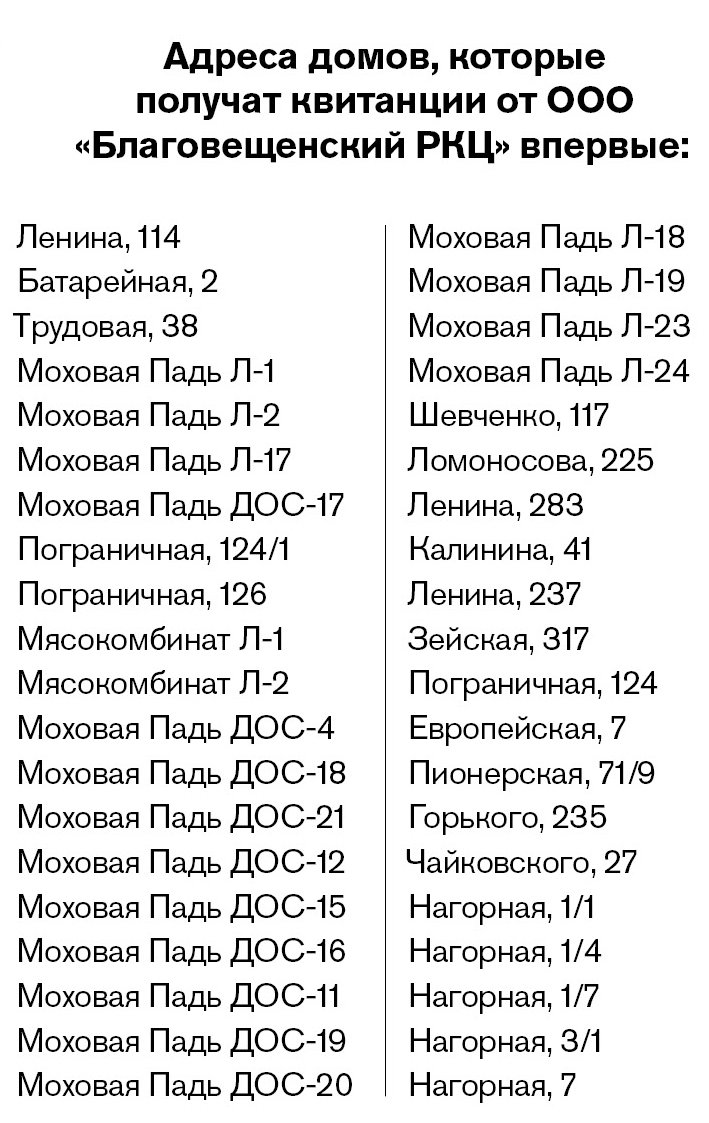 Потребителям, чей адрес входит в число домов, куда квитанции от ООО «Благовещенский РКЦ» будут направлены впервые, для совершения оплаты следует обращаться по адресу: ул. Калинина, 52. Для удобства горожан отдельно работает окно № 4. Для тех, кто не обнаружил в ящике квитанцию за тепло, горячее и холодное водоснабжение в декабре, также следует обратиться в Благовещенский РКЦ. Режим работы — с понедельника по пятницу с 8.00 до 17.00, перерыв на обед 12.00 до13.00. Также можно обратиться в центральный офис по адресу: ул. 50-летия Октября, 6/1. Дополнительную информацию предоставят по телефонам: 22-14-59, 22-14-65, 22-14-70.