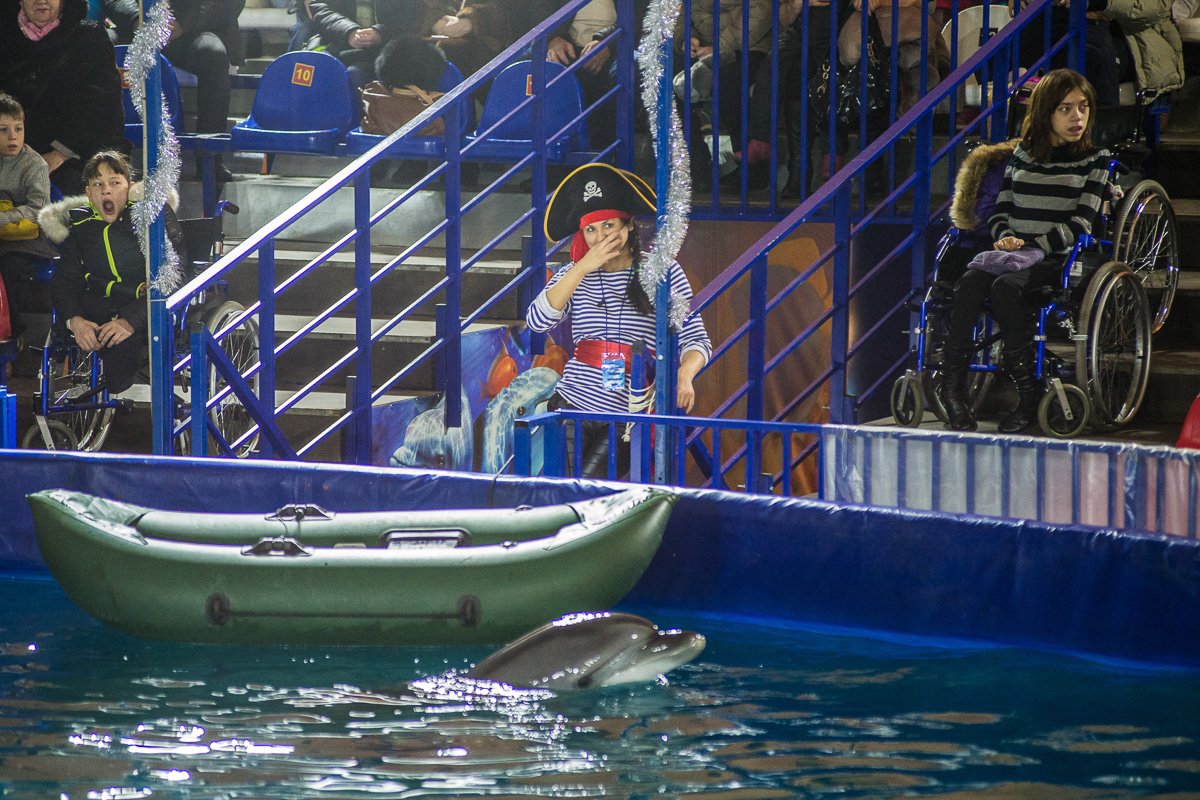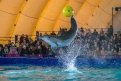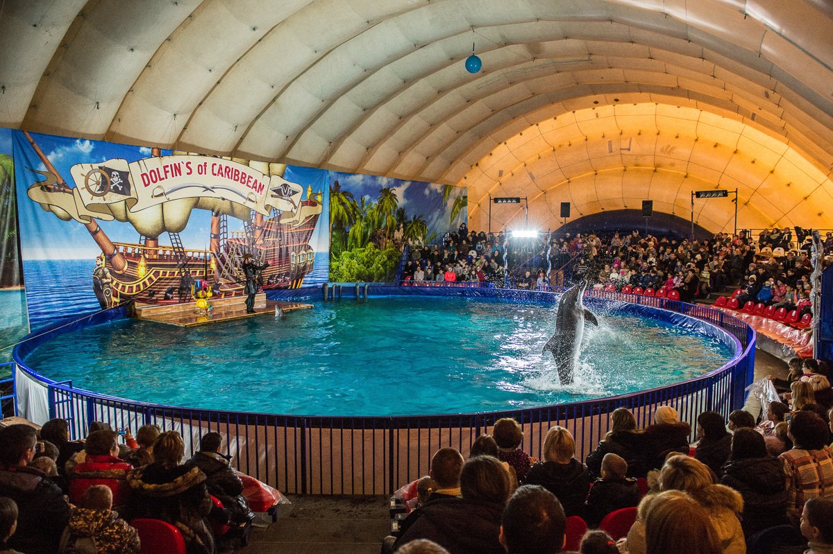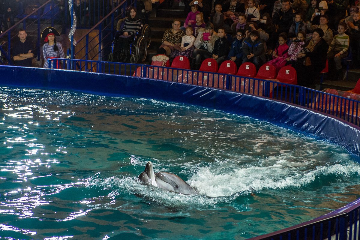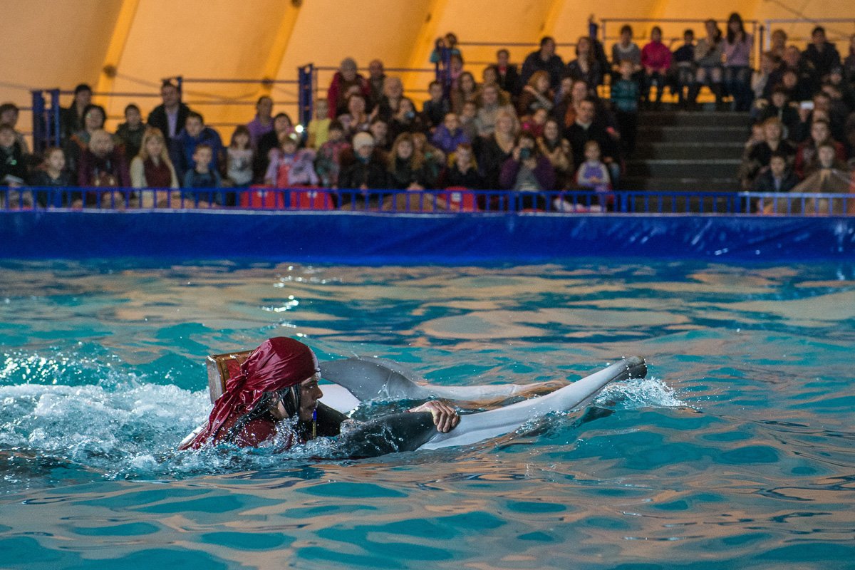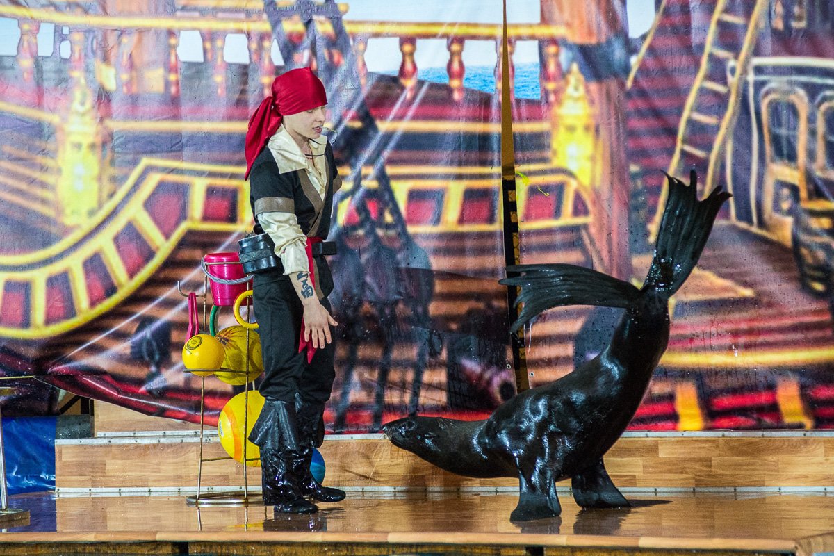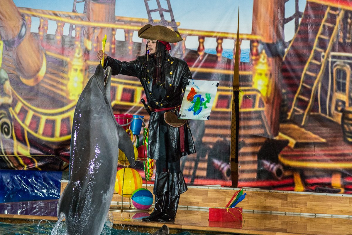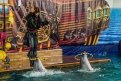 Сегодня для 800 ребятишек показали театрализованное детское шоу «Пираты Карибского моря». Юные зрители смотрели, затаив дыхание, хлопали и кричали «браво», когда дельфины танцевали медленный танец, крутили обруч и рисовали карту сокровищ.