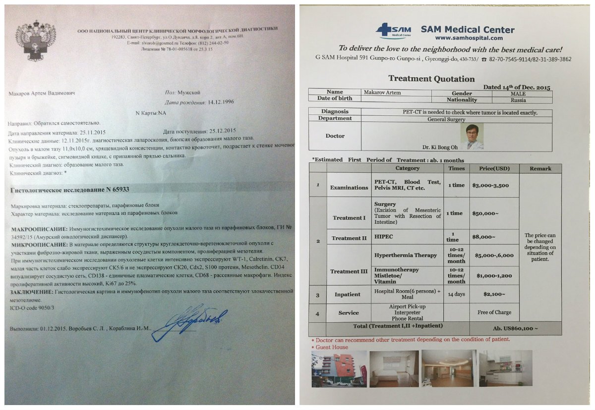 Несчастья начались в семье Макаровых в октябре. «У племянника стал болеть низ живота, после приема у врача нам поставили диагноз "хронический простатит", лечили месяц, а улучшений нет. Пошли к другому доктору, после некоторых анализов сказали, что у него новообразование, нужно проходить обследование. В конце ноября Артёма положили в местную онкологию, биопсия показала доброкачественную опухоль. Мы отправили его с родителями в Санкт-Петербург, там вновь обследование, после чего страшный диагноз: злокачественная опухоль. Доктора сказали — очень редкий диагноз. На консилиуме из 6 светил науки двое сказали оставить так, как есть, мол, сколько проживет. Четверо признались, что не уверены в положительном результате операции. Я думаю, ни один нормальный родитель после такого ответа не положит своего ребенка на хирургический стол. И Артёма выписали «в удовлетворительном состоянии».