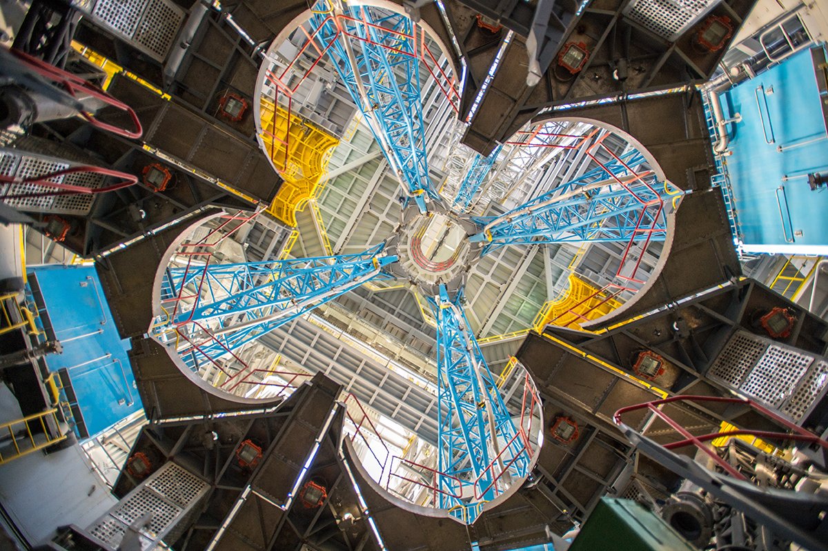 В огромном помещении, площадью почти 10 тысяч квадратов и высотой с 7‑этажный дом, одна из стен полностью стеклянная — для лучшего освещения. Под самой крышей установлены два крана грузоподъемностью 50 тонн каждый. Ее и другое погрузочное оборудование будут использовать для сборки ракеты. Одновременно в МИКе можно собирать две ракеты-носителя.