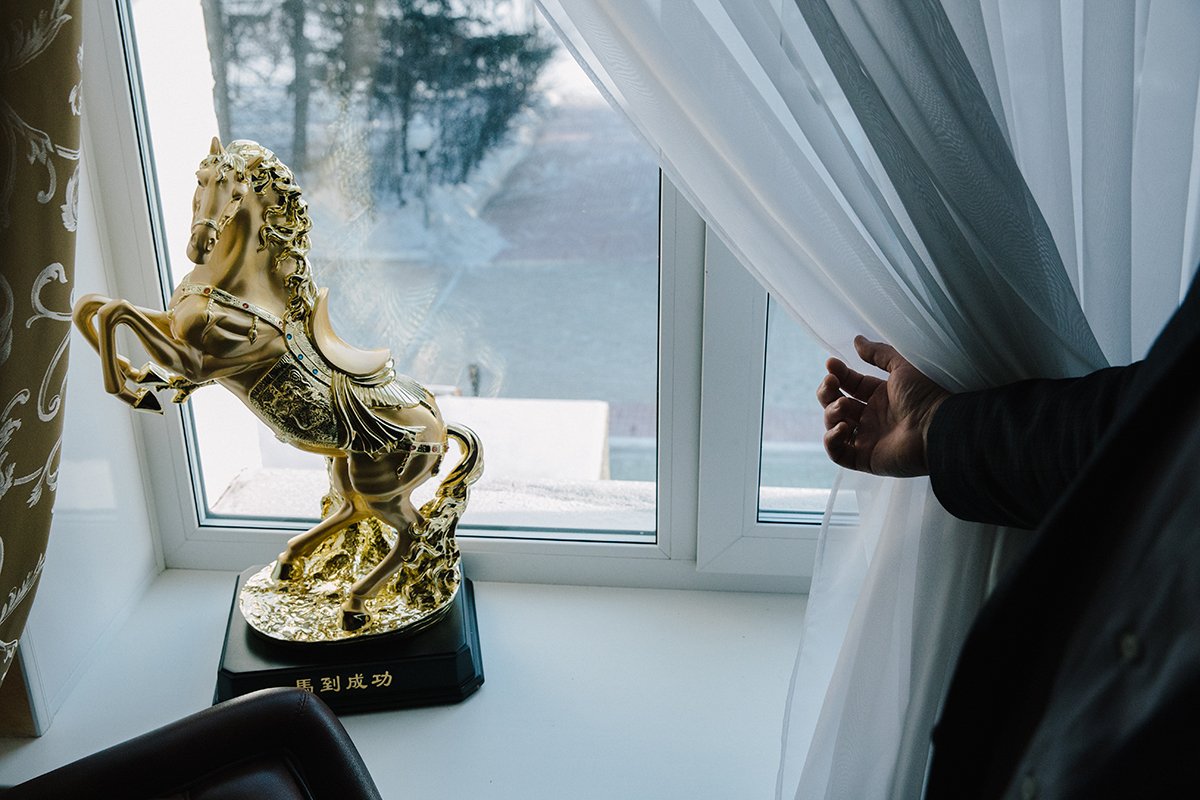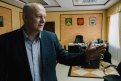 Над брутальным черным столом главы — обязательные атрибуты власти: три герба — Российской Федерации, Амурской области и Свободненского района. На последнем настоящий вулкан из пшеничных колосьев.