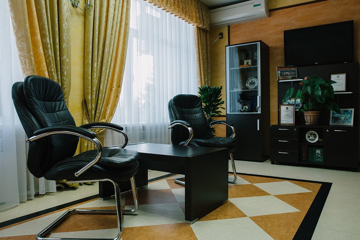 В кабинет главы может прийти любой посетитель — фермер, пенсионер, руководитель предприятия. «Каждого выслушаю и постараюсь помочь», — говорит Романов. Угольно-черный журнальный столик с двумя мягкими креслами тоже помогает в делах. «Когда мебель покупали, подумал, что надо зону отдыха сделать, где можно было бы чай попить, — рассказал историю возникновения этой части кабинета его хозяин. — В это время можно серьезные вопросы решать. На этих креслах с представителями Газпрома чай пили.