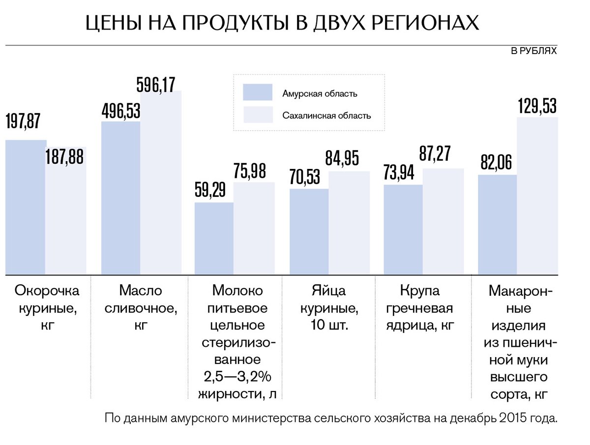 Плюс хостела и квартиры еще и в том, что там можно готовить себе самостоятельно, так как питание в местных кафе и ресторанах больно бьет по карману. И хотя в большинстве своем цены в магазинах тоже кошелек не радуют, можно найти продукты, стоимость которых будет ненамного выше, чем в столице Приамурья. Впрочем, хлеб и хлебобулочные изделия здесь стоят в два, а то и в три раза выше, чем на материке. Цена за булку хлеба высшего сорта начинается с 40—50 рублей.