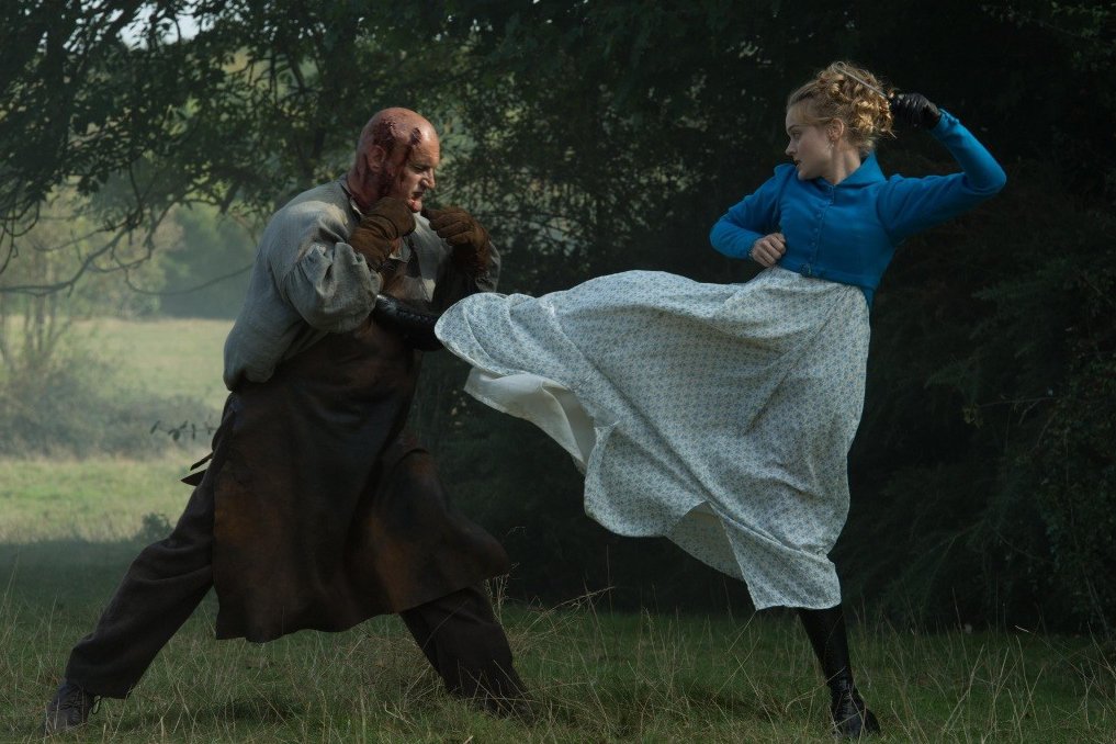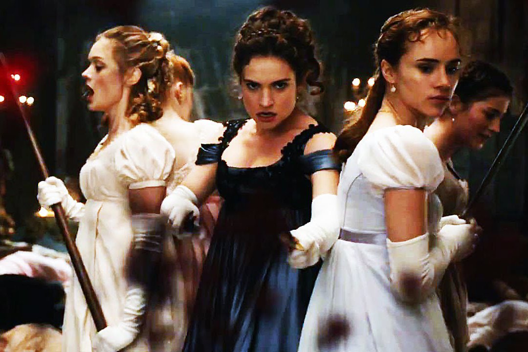 Подарив публике жестокую и смешную сцену в качестве аперитива, Стирс сразу же начинает заигрывать с формой, чтобы сделать понятнее содержание. Но предыстория в виде книжных картинок только запутывает зрителя. Впрочем, детали нашествия зомби останутся достаточно туманными до самого конца. Неизвестно, что там с остальным миром, непонятно, откуда голодные покойники берутся на каждой вечеринке, если пути их тщательно перекрываются, а с пешеходными всадниками Апокалипсиса и вовсе какая-то сумятица. И хотя сценаристы пытаются придать ходячим и бродячим мертвецам какую-то загадочность и даже умудряются поделить их на социальные классы (получается очень смешно), на самом деле их место именно там, где они находятся в названии ленты. Зато благодаря изобилию зомби сестрам Беннет есть чем заняться вместо нехитрых развлечений описываемой эпохи: фильм вообще совершает в ее изображении некую долгожданную революцию. В компании мистера Дарси и мистера Бингли девицы на выданье крошат нечисть отточенным железом, не забывая попинывать друг дружку в часы тренировок. А усевшись вечером в кружок, не вышивают, а чистят огнестрельное оружие.