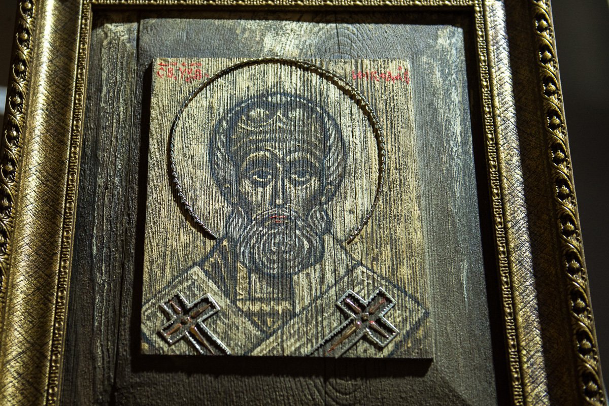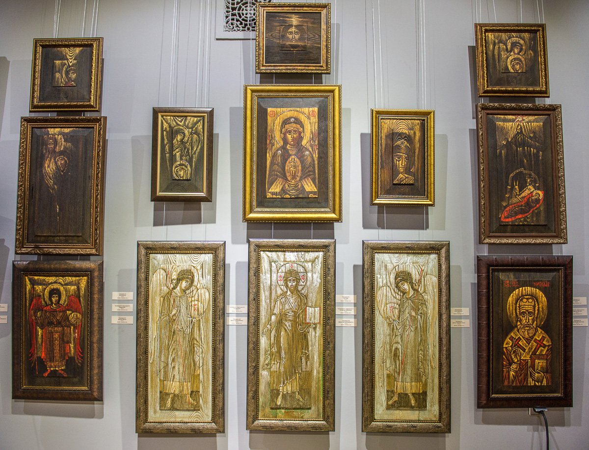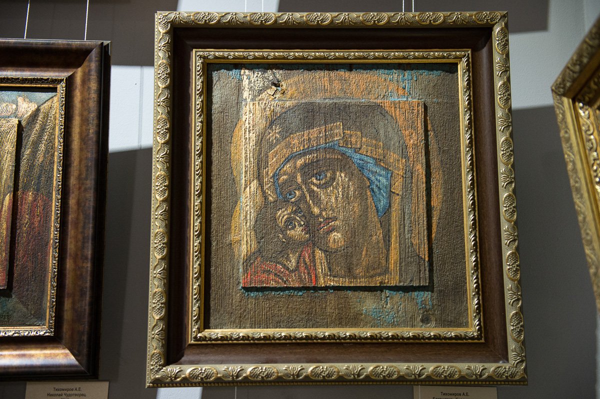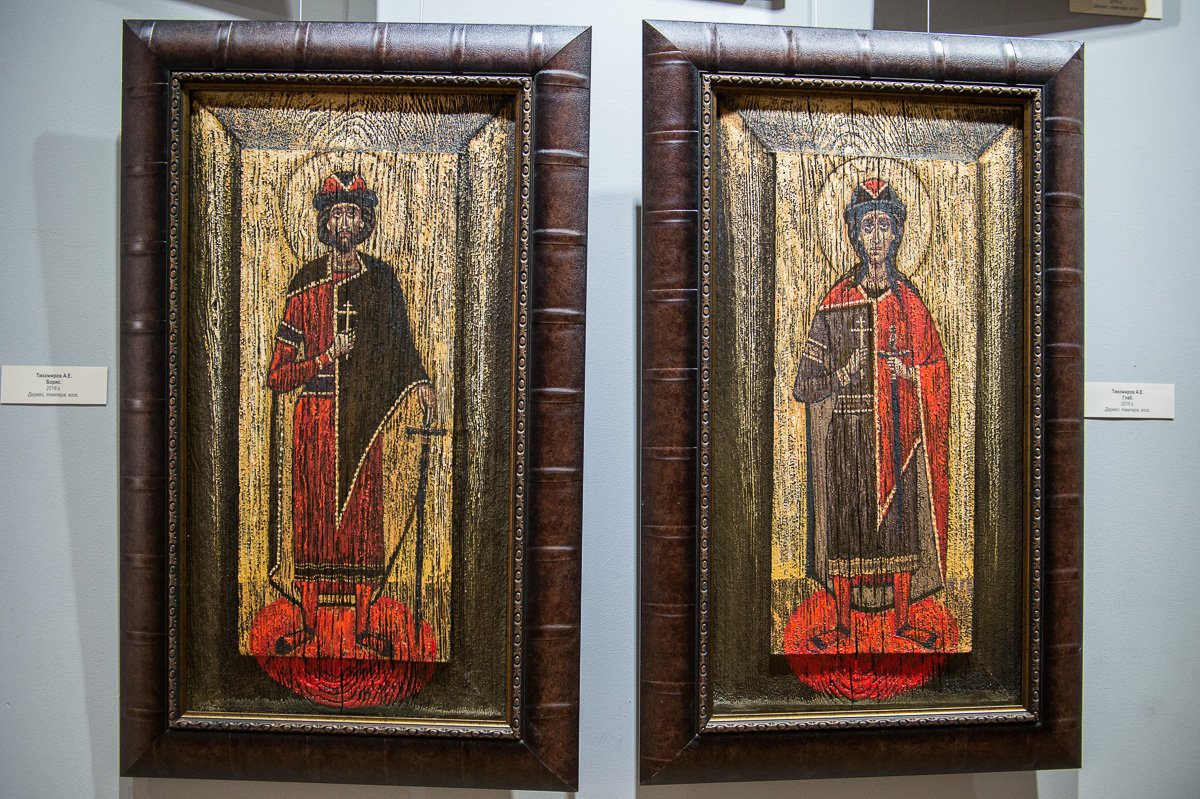 На выставке Александр Тихомиров представил около ста работ. Большая часть из них новые, выполненные в последние 2-3 года. «Мне хотелось бы отметить последний цикл, — юбиляр подвел нас к композиции из пяти работ. — В нижнем ряду Борис и Глеб — символы жертвенного единения России. Средний ряд — Деисус (икона или группа икон, имеющая в центре изображение Христа. — прим. АП). В центре Евангенгелие Христово. Оно символизирует распространение благой вести на все стороны света, а крест — ничто иное, как символ света. Рядом архангелы Михаил и Гавриил просят о заступничестве перед Спасом. Сверху — Христос в терновом венке».