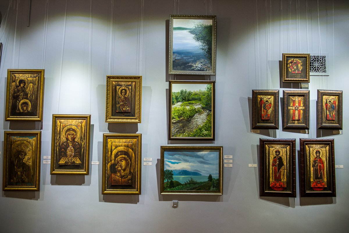В экспозиции представлено около сотни работ. Большая часть из них оконопись. Работы именно в этой технике прославили Александра Тихомирова далеко за пределами не только Амурской области, но и России. Его работы разошлись по музеям и частным коллекциям едва ли не по всему миру.