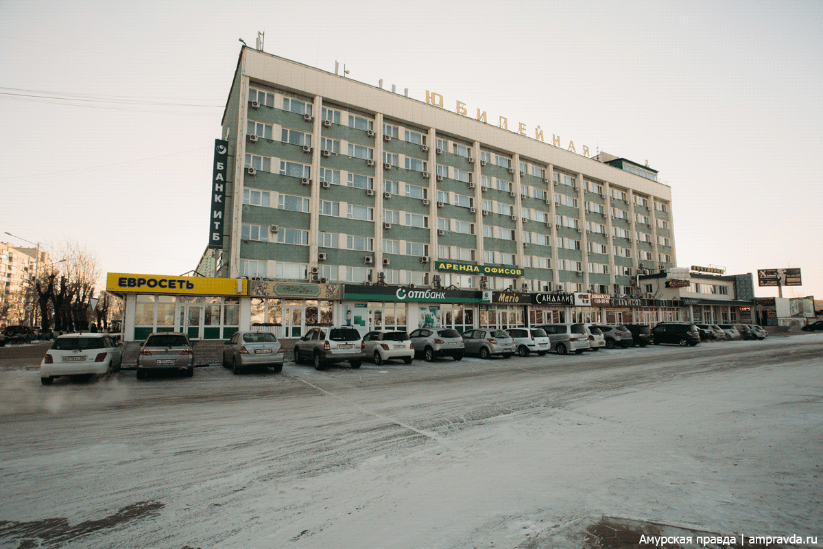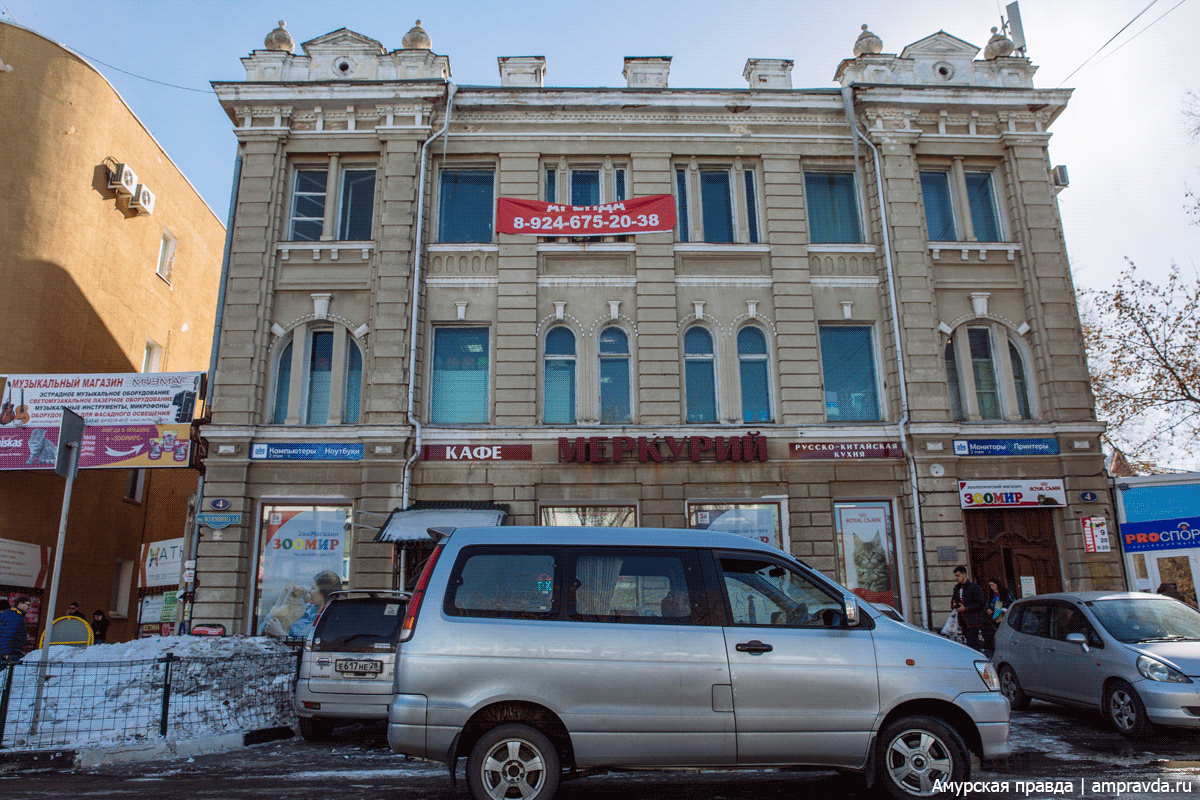 Гостиница «Зея» и часть фасада бывшего здания одноименной типографии на пересечении улиц Ленина и Калинина.