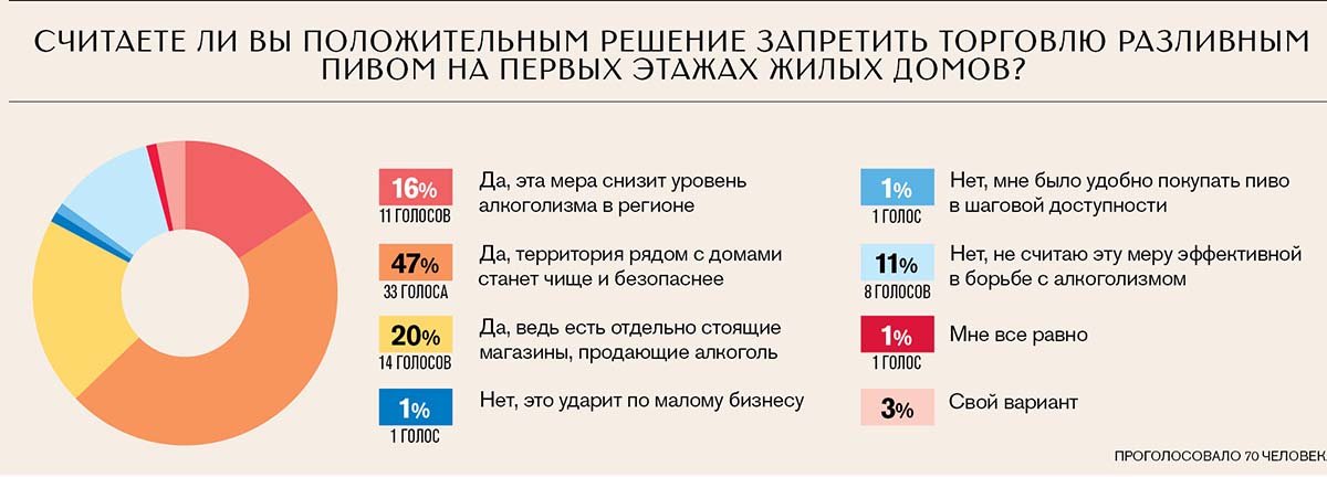 Большая часть читателей «Амурской правды» одобряет запрет на торговлю разливным пивом в жилых домах. Таковы первые итоги опроса, который стартовал на нашем сайте. По мнению почти половины участников опроса, благодаря этому запрету территория жилых домов станет чище и безопаснее. Также часть проголосовавших считает, что эта мера снизит уровень алкоголизма в регионе. Это не окончательный вердикт читателей — опрос будет идти на сайте ampravda.ru еще 12 дней.