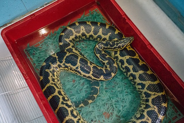В соседней комнатке трехметровая анаконда отдыхает перед выступлением в специальном аквариуме. О характере змеи говорит ее имя — Тий, что значит «тихий убийца». «А если честно, то у него очень спокойный характер, — рассказали специалисты. — Вообще змеи отличаются хорошей памятью и будут относиться к человеку так, как он к ним».