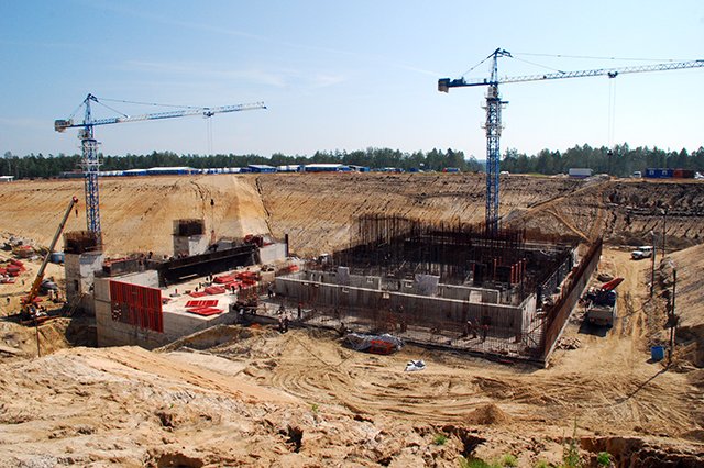 Лето 2013 года. Основные объекты стартового комплекса пока ниже уровня земли и еще не добрались до нулевой отметки. Строительство отстает от запланированных темпов.