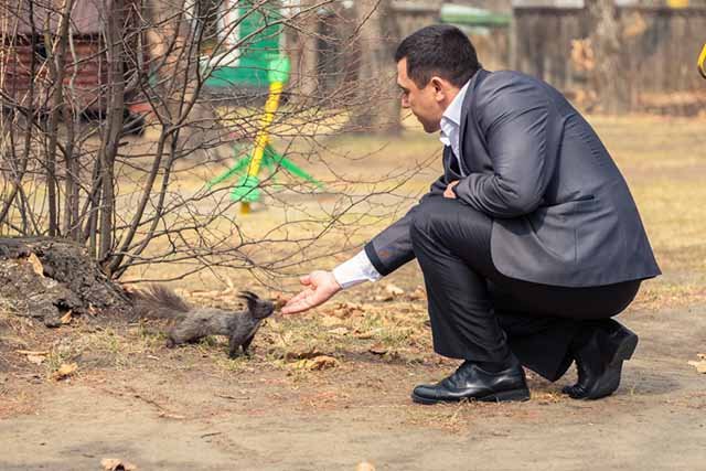 Пока мы идем по аллеям, Олег Гатауллович с увлечением рассказывает, что именно в этом парке можно встретить в большом количестве голубых сорок, занесенных в Международную красную книгу. И что живущие здесь белки предпочитают селиться в фонарях или в птичьих гнездах. А увидев на ближайшем дереве мелькнувший пышный хвост, достает из кармана строгого делового пиджака несколько семечек. Белка с удовольствием принимает угощение.