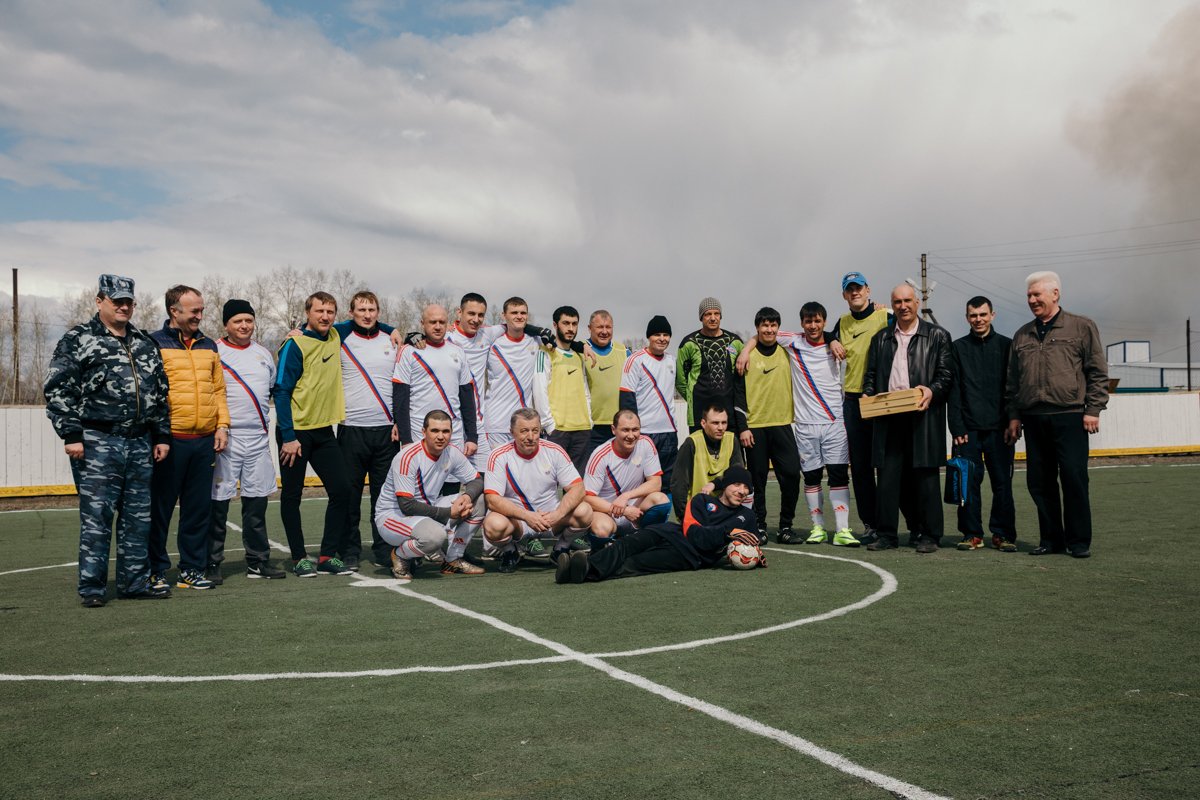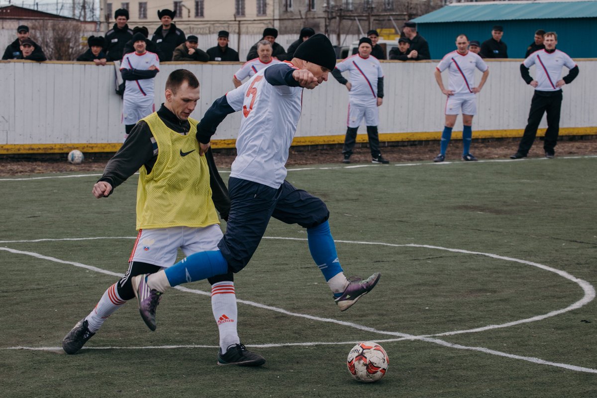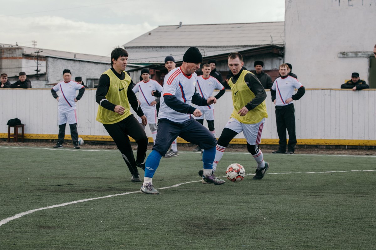 На территории промышленной зоны ИК №3 нас встречают соперники в белой футбольной форме — местный «Транзит». Они разминаются на поле, отрабатывают пасы и бьют по воротам. Не сразу понимаешь, что все игроки, причем самого разного возраста, — осужденные. И большинство проведет в колонии по 10 и больше лет, ведь здесь отбывают наказание за преступления по тяжким и особо тяжким статьям: убийство, разбой, терроризм.