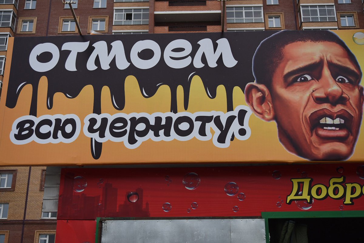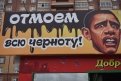 Небольшая автомойка на несколько машин находится в микрорайоне, в нескольких метрах от редакции «Амурской правды». Наверху смешной, но вполне узнаваемый портрет американского лидера Барака Обамы и многообещающая надпись: «Отмоем всю черноту!» Из-за дождя вчера в момент нашего приезда клиентов на обновленной мойке не было, лишь одиноко скучал сотрудник Виктор.