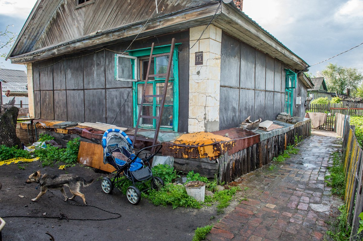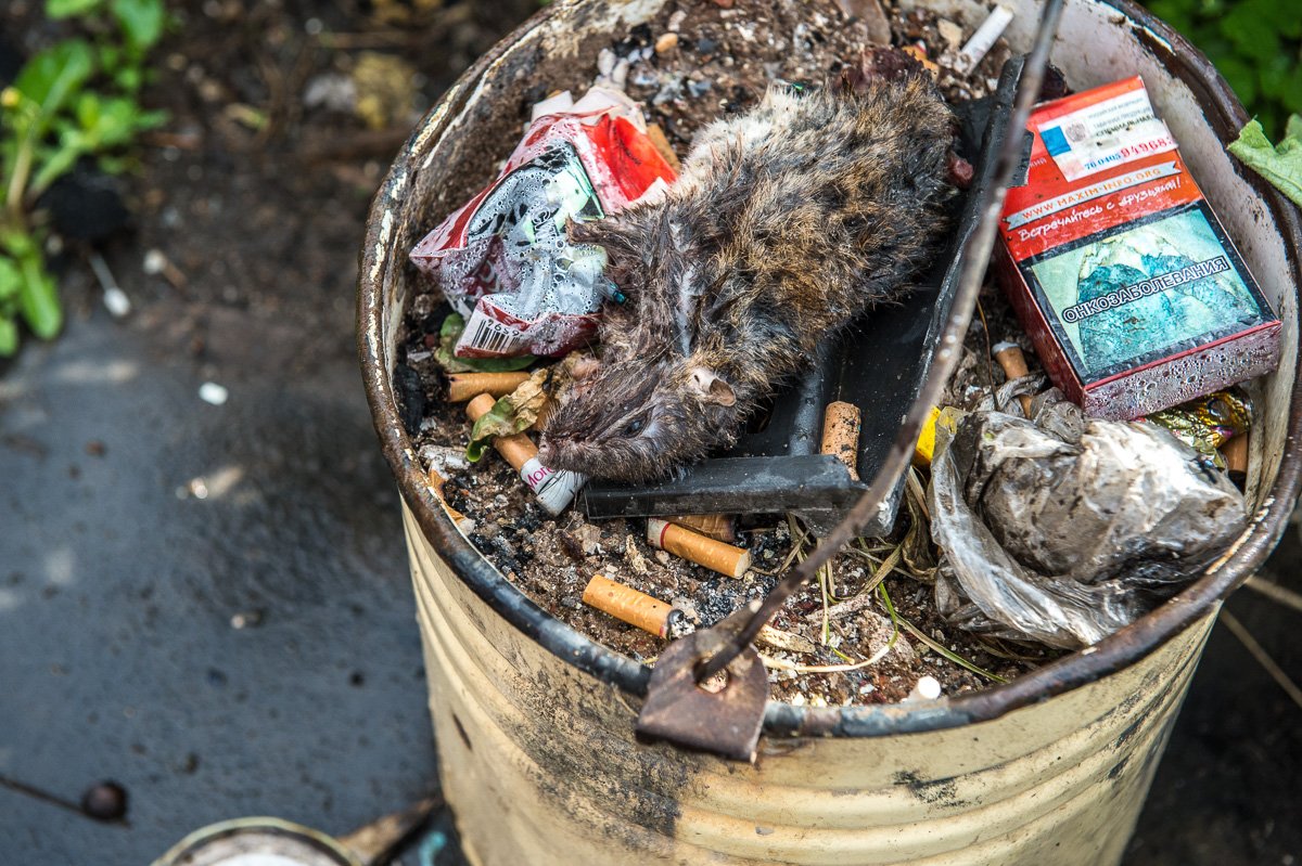 Первое, что встретило нас при входе в дом № 13, — это давящая нищета и грязное ведро возле крыльца, полное мусора, окурков, а сверху дохлая крыса. Хозяева были уже изрядно пьяны.