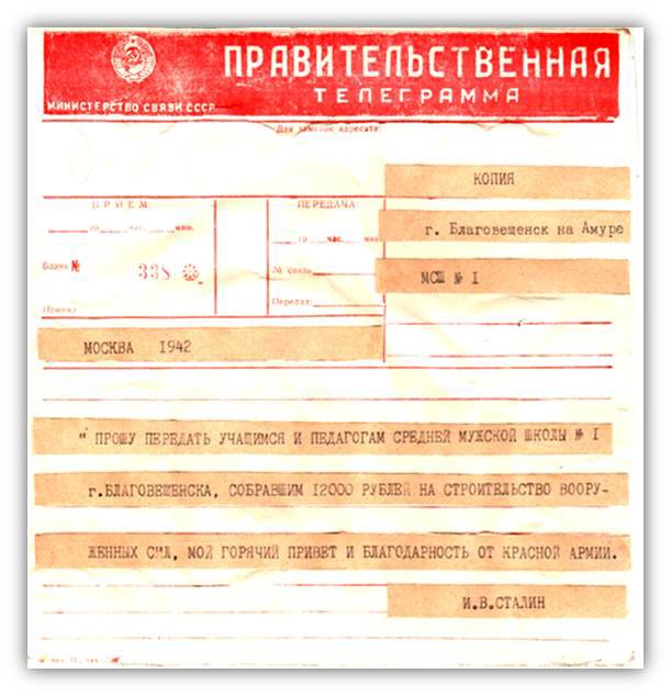 В Благовещенск в годы войны пришло несколько телеграмм от Иосифа Сталина с благодарностью коллективам предприятий и учебных заведений за помощь Красной армии. Доподлинно известно о четырех таких сообщениях, одно из которых было прислано учащимся гимназии № 1. В августе 1942 года пионеры и комсомольцы этой школы приняли активное участие во Всесоюзном воскреснике в Фонд обороны страны. Молодежь заработала средства на постройку самолета, танков, посылки бойцам. Школьники собрали много теплой одежды для солдат Красной армии и для детей из освобожденных районов. В этом же году на адрес учебного заведения пришла телеграмма от главнокомандующего страны: «Прошу передать учащимся и педагогам средней мужской школы № 1 г. Благовещенска, собравшим 12 000 рублей на строительство Вооруженных сил, мой горячий привет и благодарность от Красной армии».