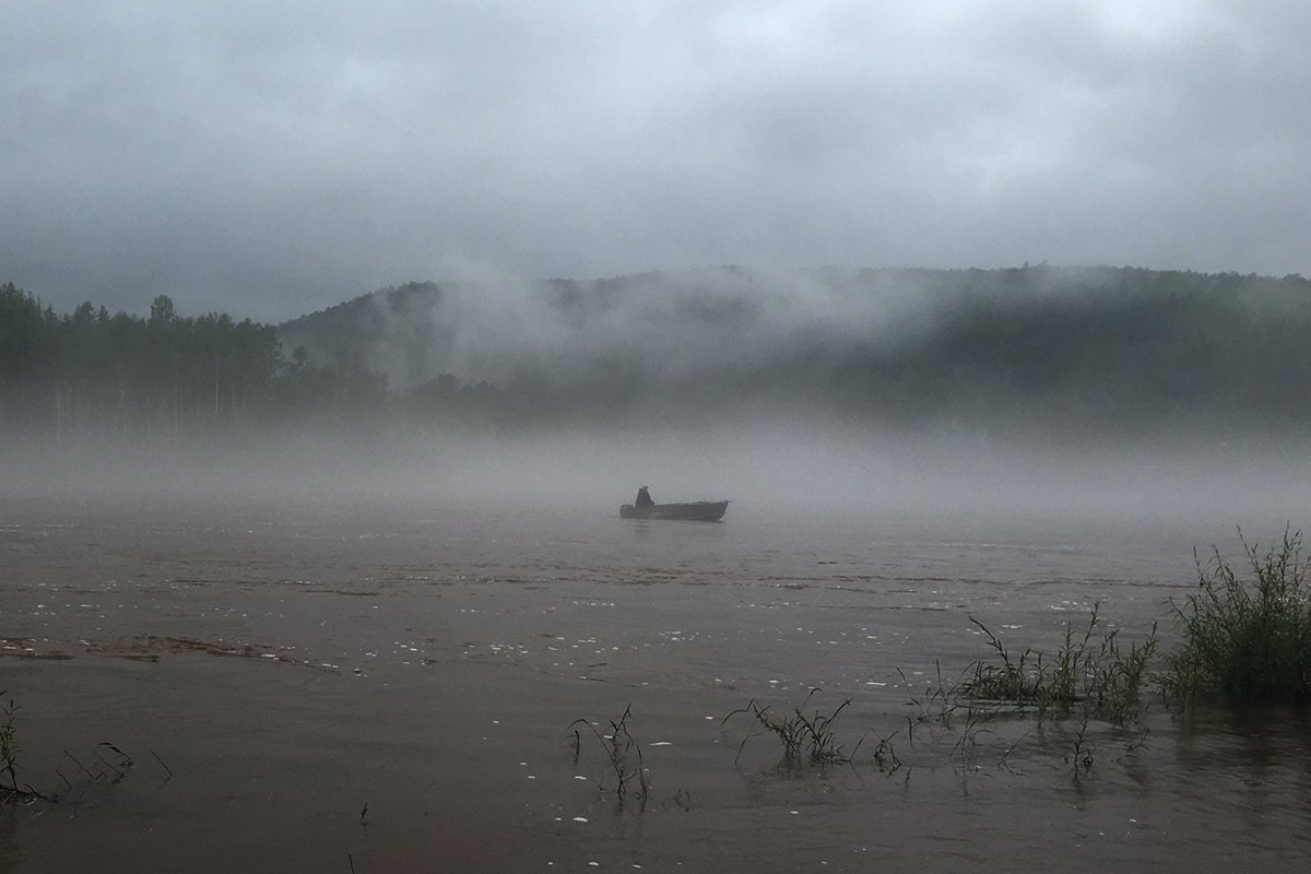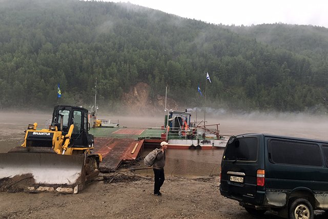 От Берегового до Гилюя 60 километров таежной дороги — это примерно полтора часа пути. В 8.30 наш микроавтобус уже у реки, которую почти не видно из-за густого тумана. Кравцов высаживает нас на сухом отрезке дороги и отгоняет машину на безопасную высоту: вода может подняться в считаные часы. Рядом — еще несколько стареньких внедорожников, на других машинах до Гилюя пока не проедешь. Чтобы дать сигнал паромщикам на противоположном берегу, один из местных жителей достает ружье, а я сразу же — фотоаппарат. «Лен, ты меня не снимай — ружье в это время нельзя с собой возить, но у нас же в тайге всякое бывает!» — с улыбкой просит он.