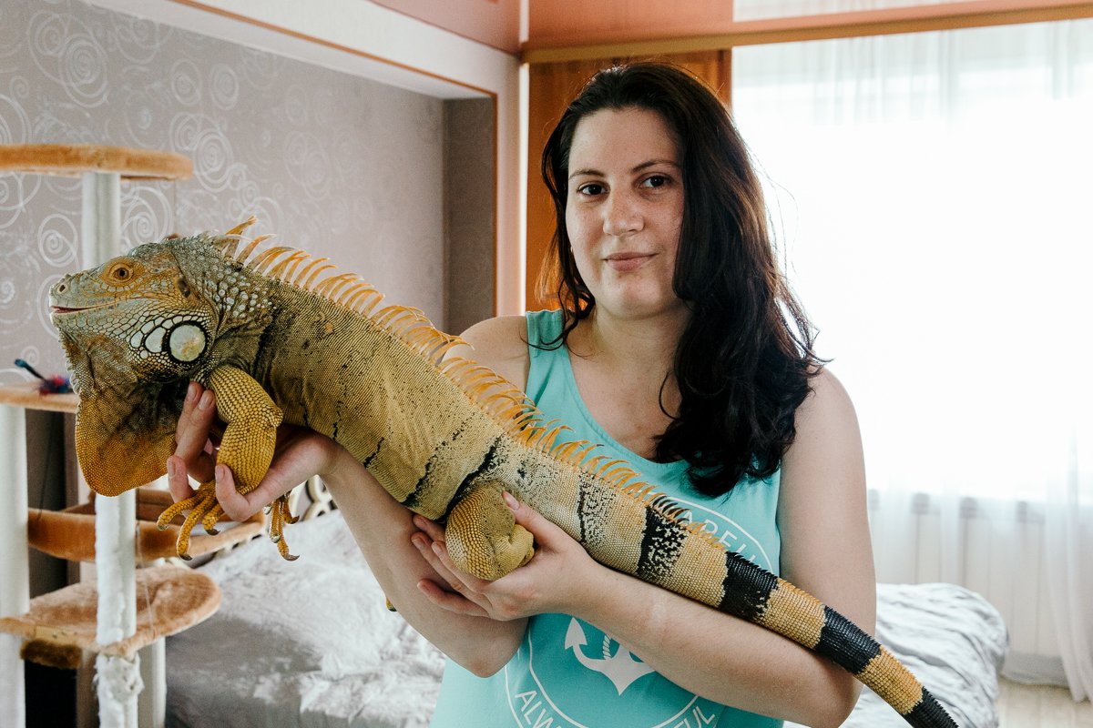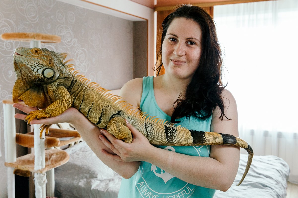 — Восемь лет назад мне на 8 марта подарили игуану. Это был желанный подарок — я с детства увлекалась экзотическими животными и грезила о такой вот ящерице. Когда она появился у меня в доме, то была размером всего 10—15 см и ярко-салатного цвета. Я назвала ее Зеленый. Со временем игуана росла и меняла окраску. Сейчас это желтая полутораметровая ящерица. Она живет в специальном террариуме, где поддерживается необходимая температура с помощью обогревателя. Игуаны хладнокровные и не могут вырабатывать тепло самостоятельно, поэтому в клетке должно быть не меньше 30 градусов тепла. Иногда мы ее выпускаем гулять по квартире, но ненадолго — за пределами своего микроклимата ей некомфортно и холодно, она может даже заболеть.