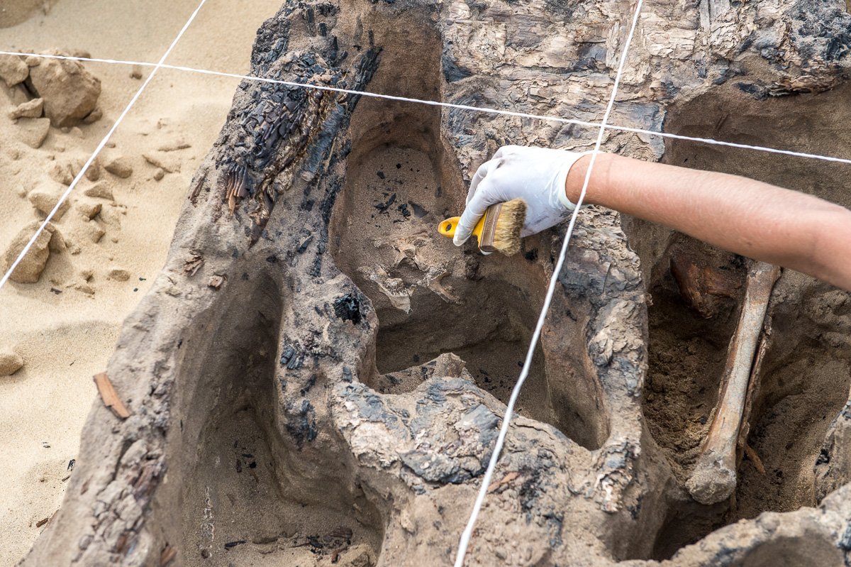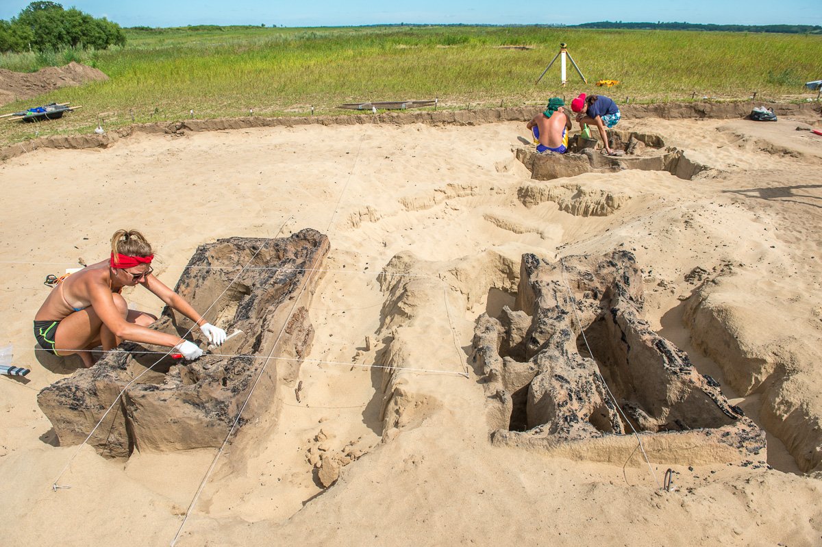 Останки «первичников» и «вторичников» археологи находят на всем «пятачке», но часть могил отличается из общей массы. Тела не просто лежат в песке — они огорожены сожженными деревянными каркасами, похожими на гробы.