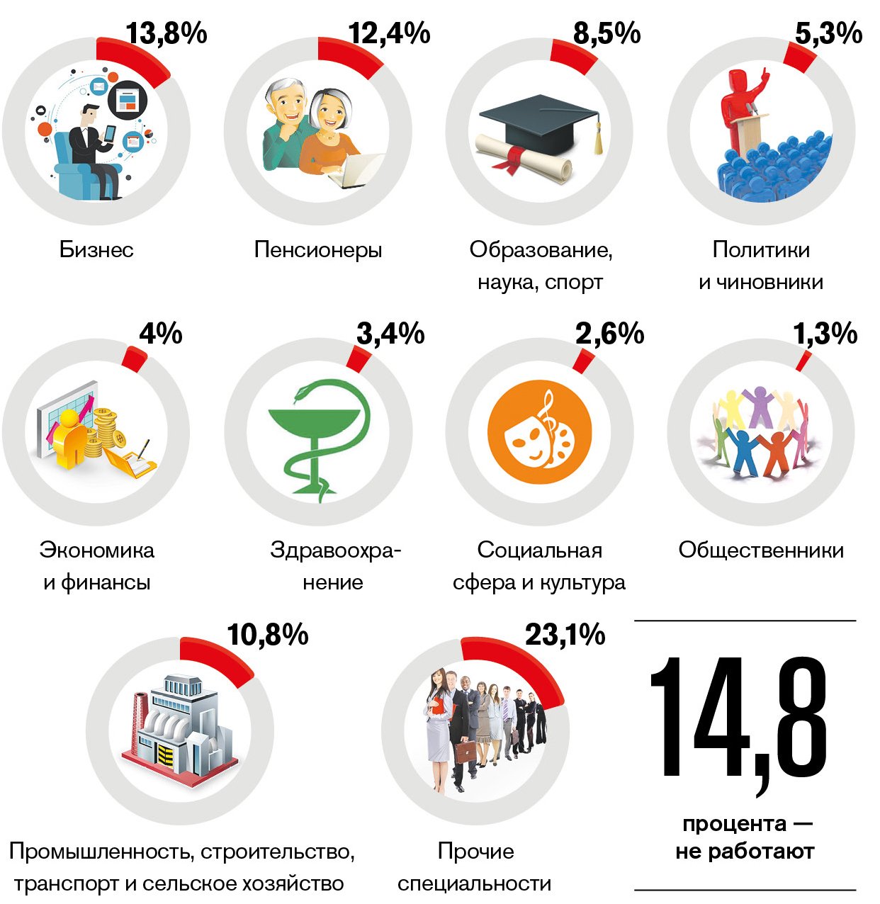 Профессии нынешних претендентов на места в Заксобрание охватывают практически все слои общества — от уборщицы до руководителя крупного бизнеса, а также все сферы деятельности — от образования и медицины до золотодобычи и газовой промышленности. При этом достаточно много среди кандидатов неработающих граждан. Лидерами по числу безработных стали КПСС, «За женщин России» и «Пенсионеры России». Также «Пенсионеры России» и Партия пенсионеров за справедливость логично включили в свои списки больше всего людей, завершивших трудовую деятельность.