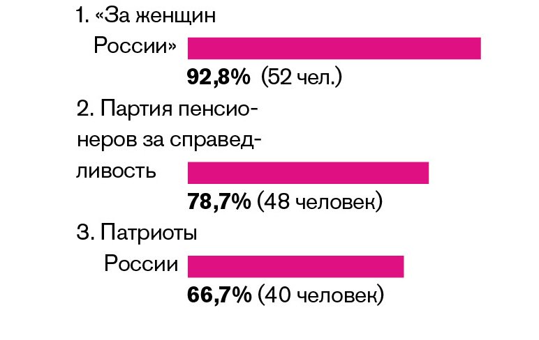Большинство партий на этих выборах делает ставку на мужчин-кандидатов. К примеру, сильный пол преобладает во всех четырех парламентских партиях. Меньше всех полагается на сильное плечо партия «За женщин России», в свои ряды амурские женщины взяли только четырех мужчин.