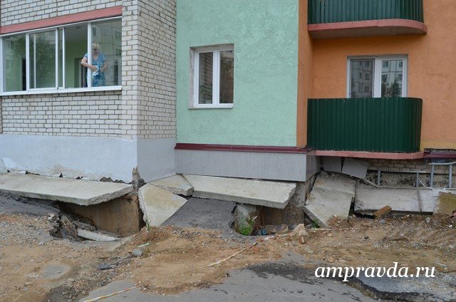 Дом на Верхненабережной, 43, был построен в 2012 году компанией «Буреягэсстрой». После его заселения начались проблемы: просели грунт, трубы канализации и асфальт, разрушилась кирпичная кладка цоколя и деформировались отмостки здания, отслоилась штукатурка на фасаде.