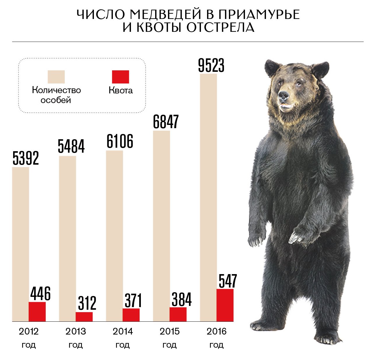 Вместе с тем, по данным амурского охотуправления, в регионе резко выросла численность бурых медведей. За прошедший год специалисты насчитали на 2676 особей больше, чем в предыдущем году. В результате их популяция сегодня насчитывает 9523 животных. Такое резкое увеличение популяции специалисты связывают с отсутствием мероприятий по регулированию численности этого зверя. Хищников с каждым годом становится все больше, при этом ареал их обитания остается прежним, и они начинают выходить к населенным пунктам.