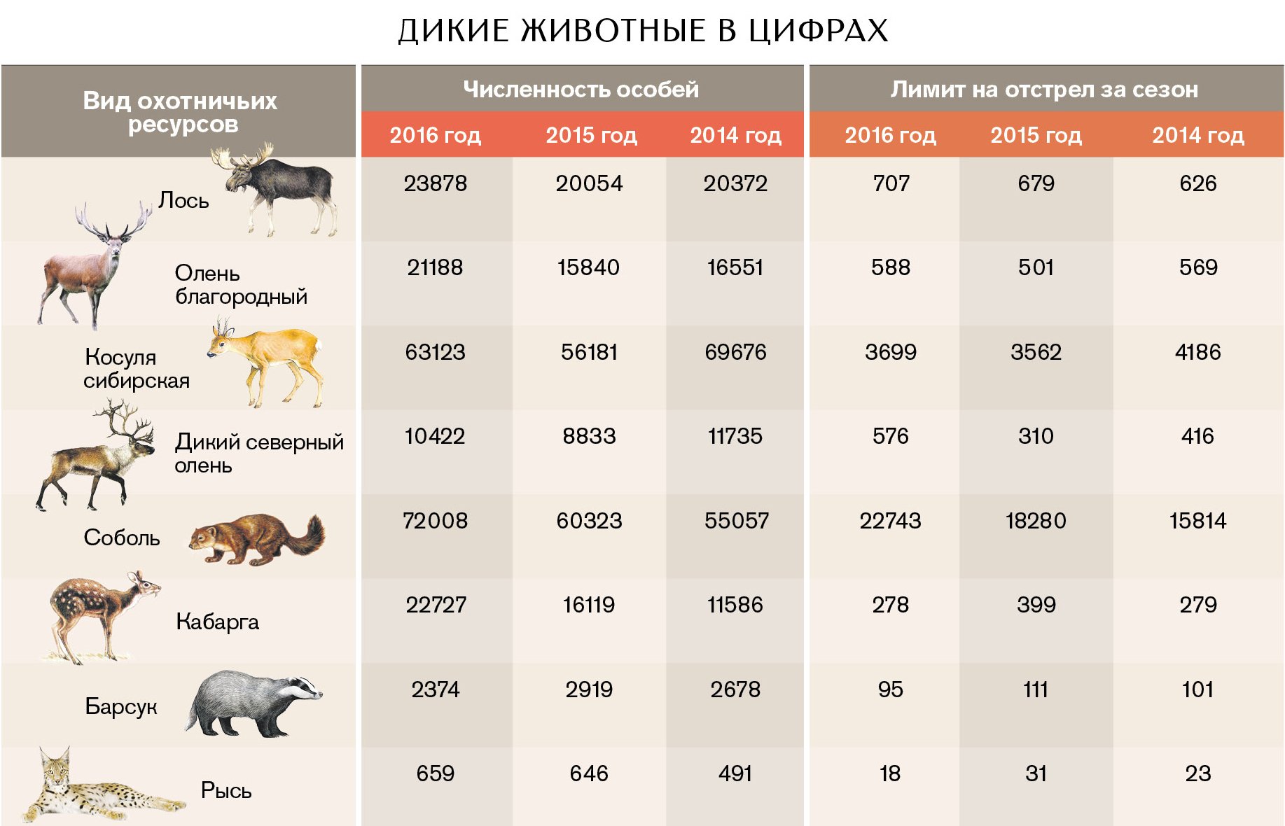— Что касается численности, указанной в лимитах на добычу, то она составляется исходя из количества особей, обитаемых в отдельных охотугодьях, — пояснили АП в управлении. — Квоты же полностью зависят от потребности промысловых хозяйств. Именно они представляют нам запросы на отстрел определенного количества животных. При этом, как показывает практика, освоение утвержденных лимитов охотхозяйствами составляет от 50 до 70 процентов.