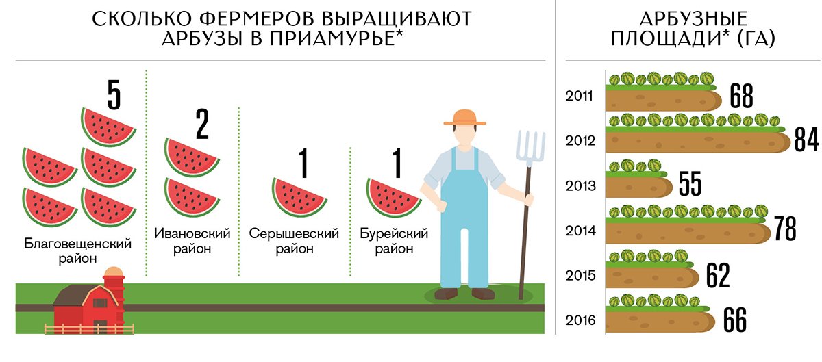 По данным минсельхоза области, в этом году арбузы на своих полях посадили 9 фермеров. Впрочем, их число год от года почти не меняется, как и площади — в Приамурье еще никогда не отводили под арбузы в общей сложности больше 100 гектаров. Хотя с конца 90‑х до начала 2000‑х спрос на эту культуру был огромный.