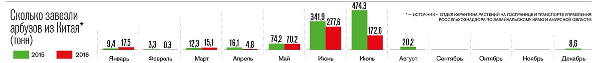 Китайские арбузы в область везут почти круглый год с перерывом на осенние месяцы. На юге Китая в теплицах снимают по три урожая арбузов. Пик поставок полосатой ягоды из Поднебесной в июне — июле, когда амурские арбузы еще только созревают в полях. Но стоит местным плодам появиться на прилавках, как импорт из‑за Амура резко падает.