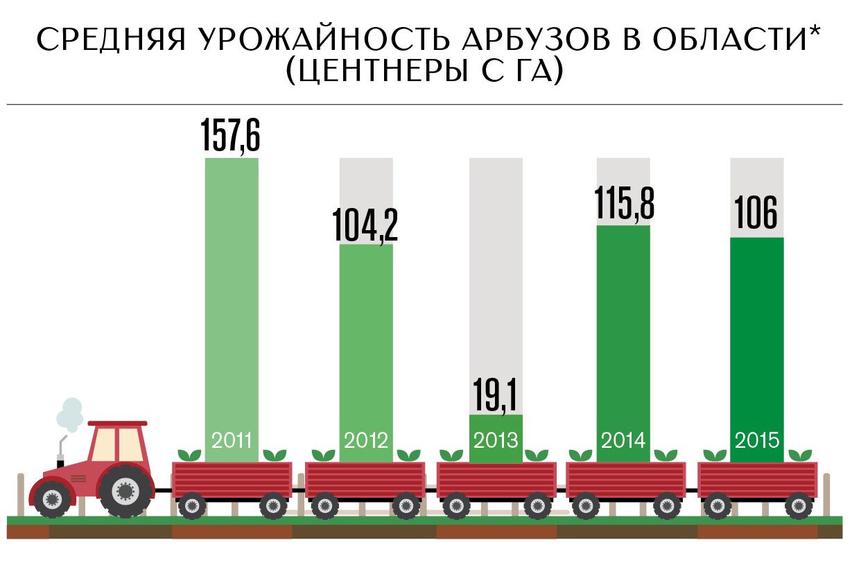 миллиона тонн арбузов вырастили в России, по данным на 2012 год. Это больше, чем в Узбекистане, где урожай тогда составил 1,35 миллиона тонн. Мировой лидер по производству арбузов — Китай, где в 2012 году вырастили 70 миллионов тонн бахчевых