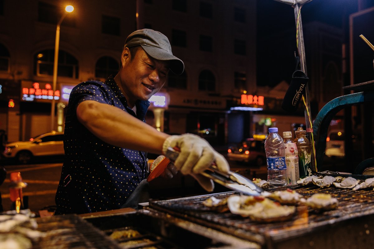 В этом году на улицах Хэйхэ очень популярны устрицы, мидии и морские гребешки на гриле. Раковину с моллюском заполняют крахмальной лапшой, добавляют соевый соус, чеснок, немного воды, мелкие креветки и жгучий красный перец. Нафаршированные таким образом половинки раковин ставят на решетку и варят несколько минут. Есть нужно палочками прямо из ракушки. Кстати, лапшу здесь могут приготовить не только в раковинах, но и в кокотницах.